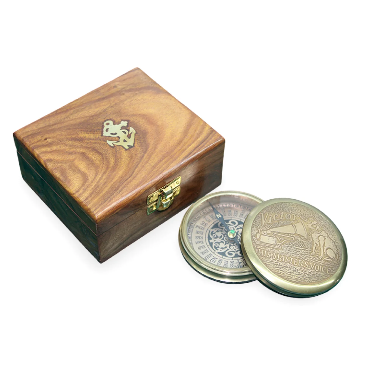 Ahşap Kutulu Antik Pirinç Denizci Pusulası His Master's Voice Gravürlü Dekoratif Hediye