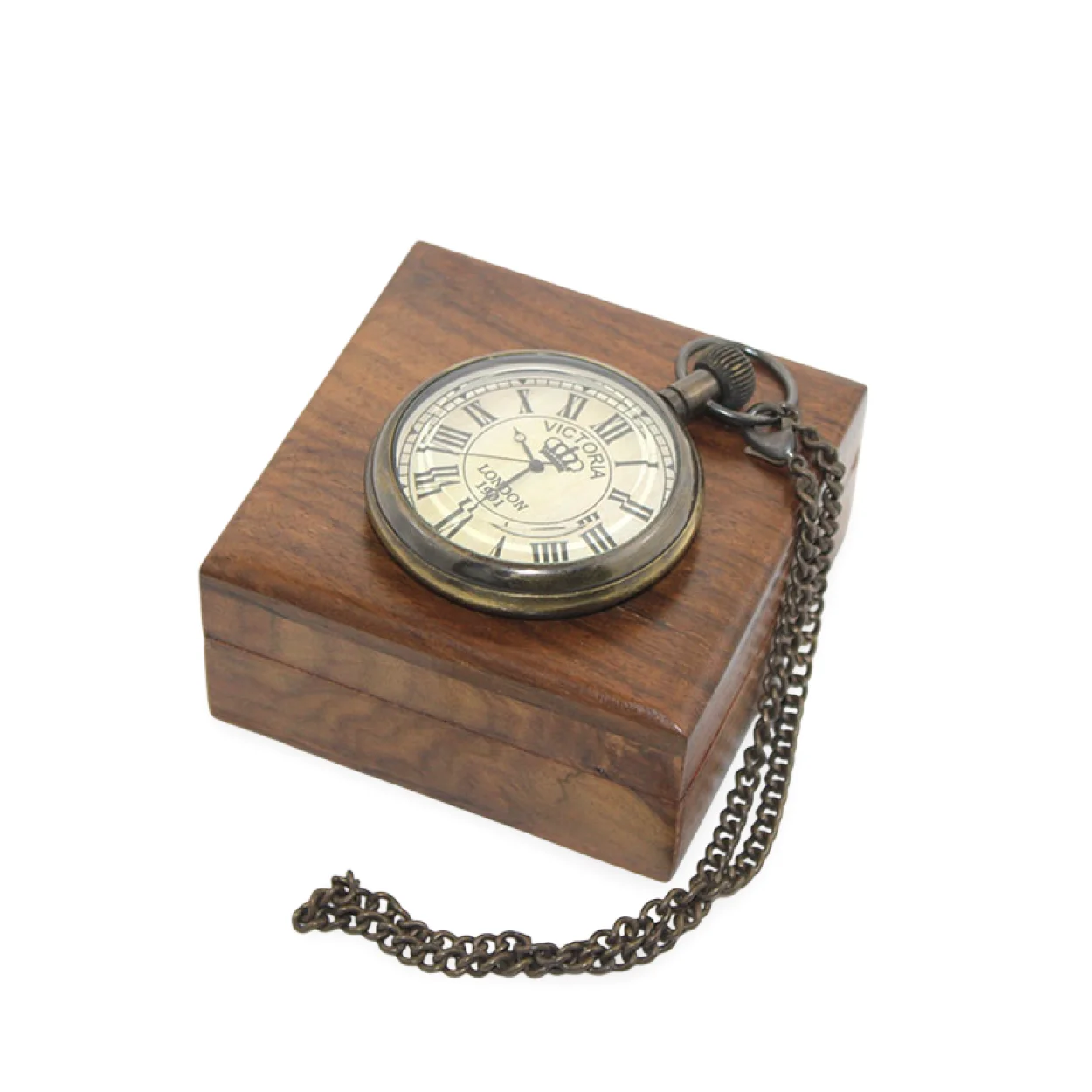 Bu köstekli saatin ana malzemesi olan yüksek kaliteli pirinç, ona hem dayanıklılık hem de zamanla oluşacak patinalı görünümü sayesinde otantik bir hava katmaktadır. Saatin kadranındaki Roma rakamları ve dikkat çekici "VICTORIA LONDON 1901" yazısı, geçmişten gelen bir hikayeyi fısıldar gibidir. Bu özel detaylar, ürünün sadece bir aksesuar değil, aynı zamanda tarihi bir referans taşıdığını gösterir. Zarif bir zincirle tamamlanan köstekli saat, kullanım kolaylığı ve estetik bütünlük sunar. Saat, özenle tasarlanmış ahşap kutusu içinde gelir. Bu ahşap kutu, saatin korunmasını sağlamakla kalmaz, aynı zamanda ürüne ek bir değer katarak onu daha özel bir hediye haline getirir. Ahşabın doğal dokusu ve sıcak rengi, pirincin antik görünümüyle mükemmel bir uyum içindedir. Kutunun kapalı haliyle dahi zarif bir görünüm sergilemesi, ürünün genel estetiğine katkıda bulunur. Kutu, saati güvenle saklarken, aynı zamanda sunumunu da zenginleştirir.