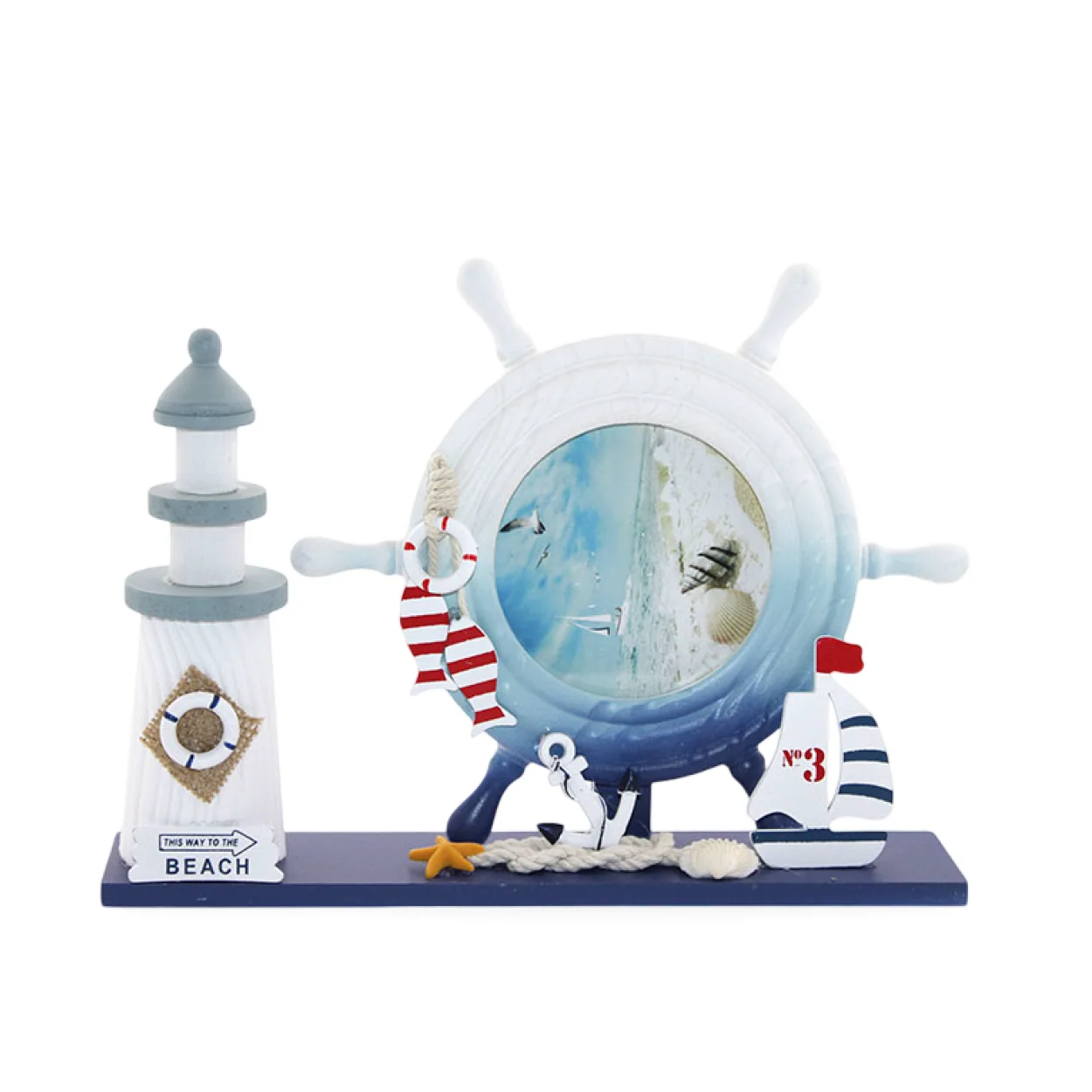 Ürün, sağ tarafta detaylı işlenmiş bir deniz feneri biblosu, sol tarafta ise bir gemi dümeni şeklinde tasarlanmış dikkat çekici bir fotoğraf çerçevesi barındırır. Dümen çerçevesinin içindeki sahil manzarası, kuşlar ve deniz kabukları, ürünün marin temasını pekiştirir. Ana platform üzerinde yer alan minyatür yelkenli tekne, çapa, deniz yıldızı ve deniz kabuğu gibi detaylar, deniz tutkunları için eşsiz bir görsel şölen sunar. El yapımı hissi veren ahşap dokusu ve özenle seçilmiş renk paletiyle evinizin her köşesine ferah bir hava katacaktır.