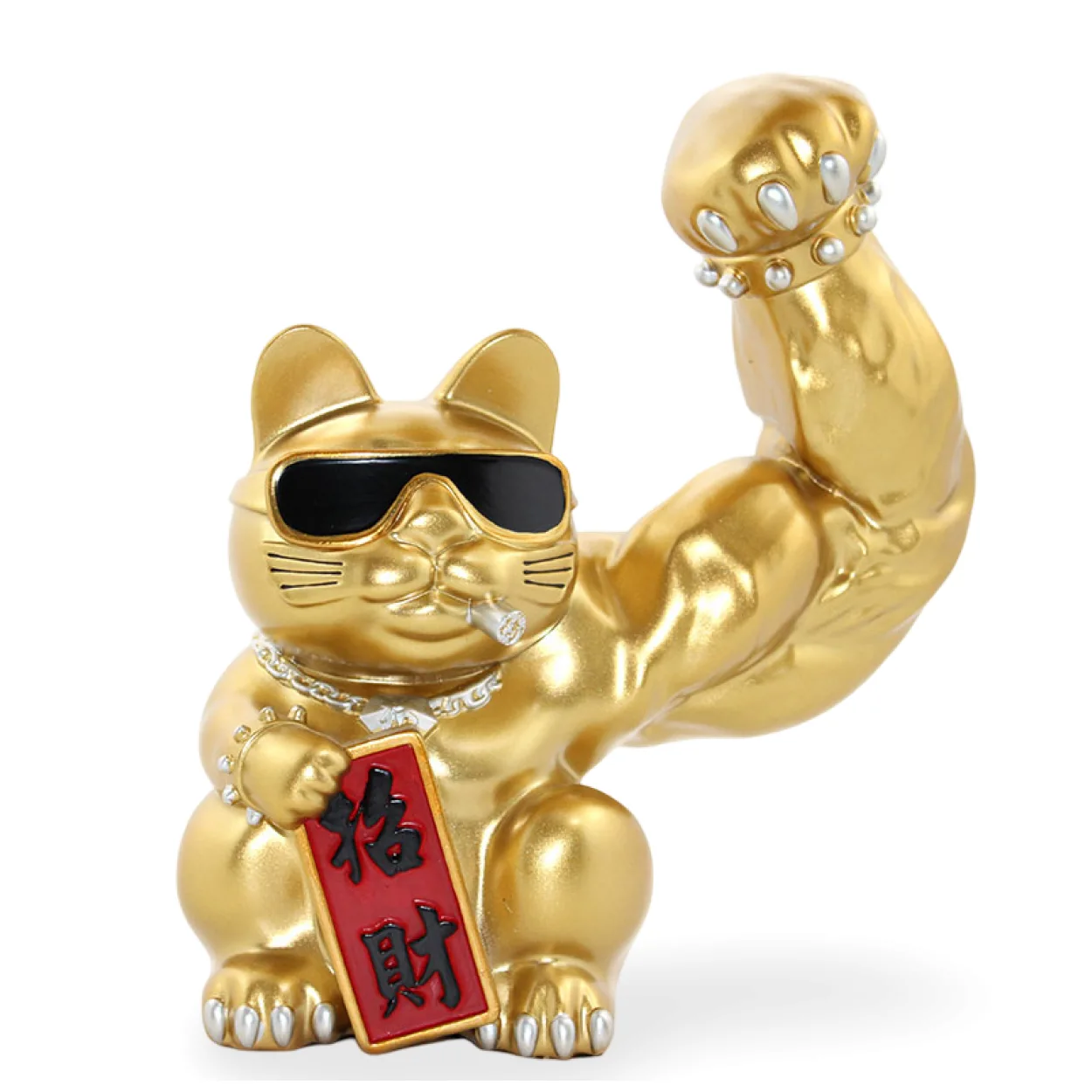Evinize veya ofisinize hem şans hem de tarz katacak Altın Renk Havalı Şanslı Kedi Figürü ile tanışın! Bu eşsiz biblo, geleneksel şans kedisi motifini modern ve güçlü bir duruşla birleştiriyor. Gözlükleri, ağzındaki purosu ve kaslı koluyla dikkat çeken bu biblo, bakışları üzerine çekecek karizmatik bir duruş sergiliyor.