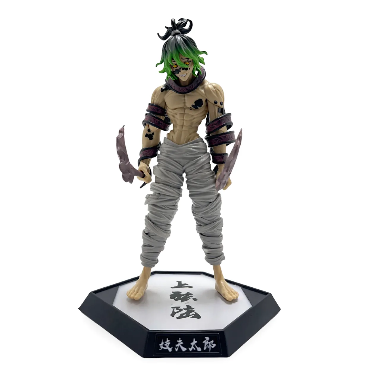 Bu özel Gyutaro figürü, 30 cm'lik etkileyici boyutlarıyla dikkat çekiyor. Detaylara verilen önem sayesinde, figürün her noktasında karakterin orijinal görünümünü sadık bir şekilde görebilirsiniz. Siyah ve yeşil renkteki asi saçları, yüzündeki iblisvari işaretler ve kaslı yapısı özenle işlenmiştir. Kollarındaki sargılar ve buruşuk görünümlü gri pantolonu gibi kıyafet detayları da, figürün görsel zenginliğini artırmaktadır. Gyutaro'nun ellerinde tuttuğu ölümcül tırpan benzeri bıçaklar, pozuna dinamizm katarken, siyah altıgen kaidesi üzerinde yer alan Japonca karakterler ("Üst Rütbe Altı" ve "Gyutaro") otantik bir dokunuş sunar.
