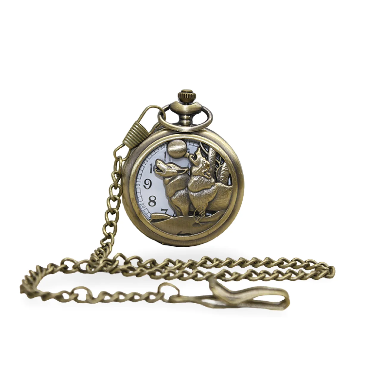 Bu muhteşem cep saati, detaylı bir kurt motifine sahip. İki kurt figürü, ay ışığı altında ulurcasına tasvir edilerek, vahşi doğanın gücünü ve gizemini saatinize taşıyor. Antik bronz rengi ve oyma detayları, ürüne vintage bir hava katarken, zamansız bir şıklık sunar. Saatin kapağındaki bu sanatsal işçilik, sadece bir zaman göstergesi olmanın ötesinde, göz alıcı bir dekoratif obje niteliğindedir.