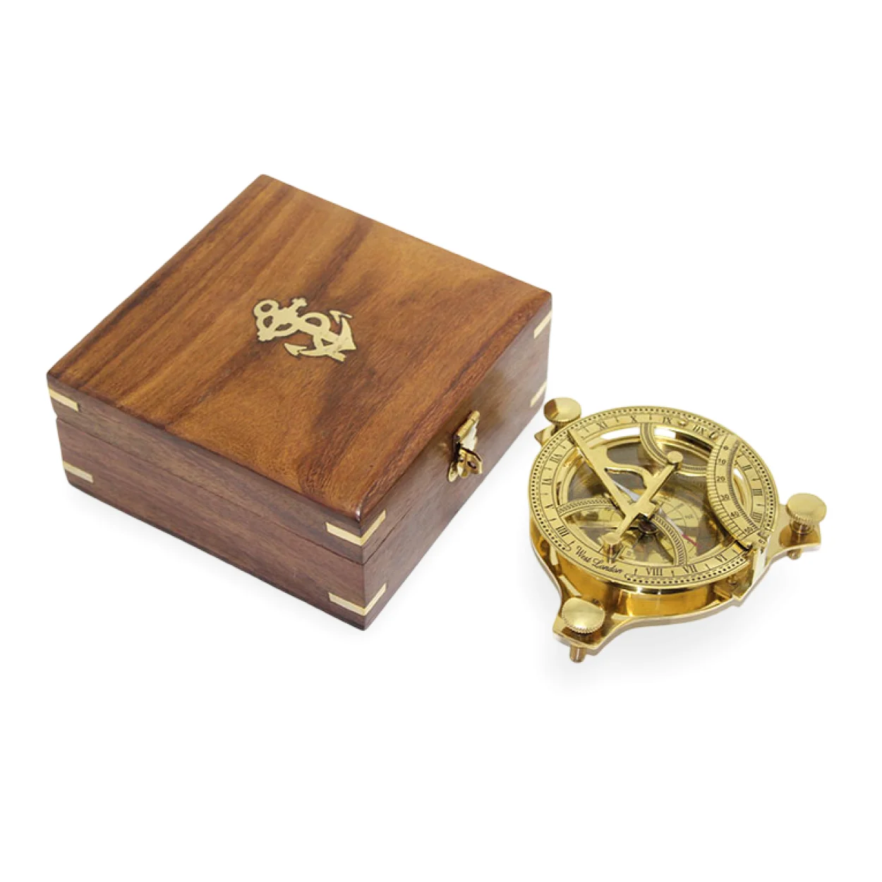Antik Görünümlü El Yapımı Pirinç Güneş Saati ve Pusula, Özel Ahşap Kutusuyla | Denizci Temalı Koleksiyonluk Hediyelik Eşya