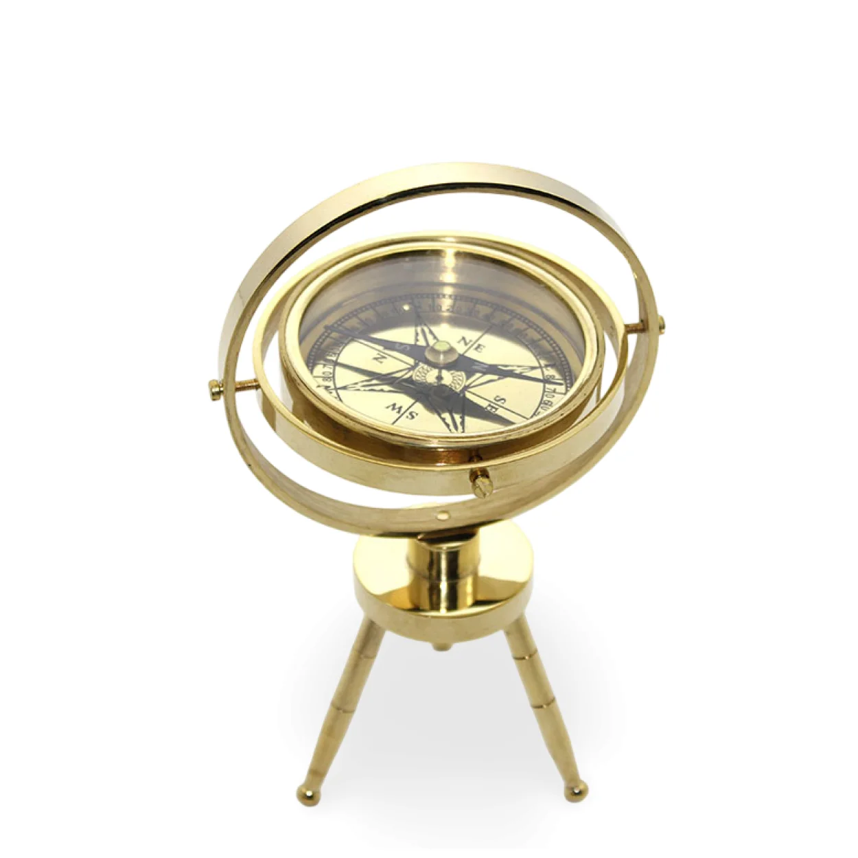 - Gimbal (Askılı) Mekanizma: Bu özel pusula, gemilerde dengeyi korumak ve doğru yönü göstermek için kullanılan gimbal mekanizmasına sahiptir. İki halkalı bu askılı yapı, pusulanın sallanan bir yüzeyde bile her zaman yatay kalmasını sağlar. Bu özellik, ürüne hem otantik bir denizcilik hissi verir hem de masa başında dahi hassas bir yön gösterimi sunar. Aynı zamanda estetik olarak da oldukça etkileyicidir ve dönemin mühendislik harikasını gözler önüne serer.