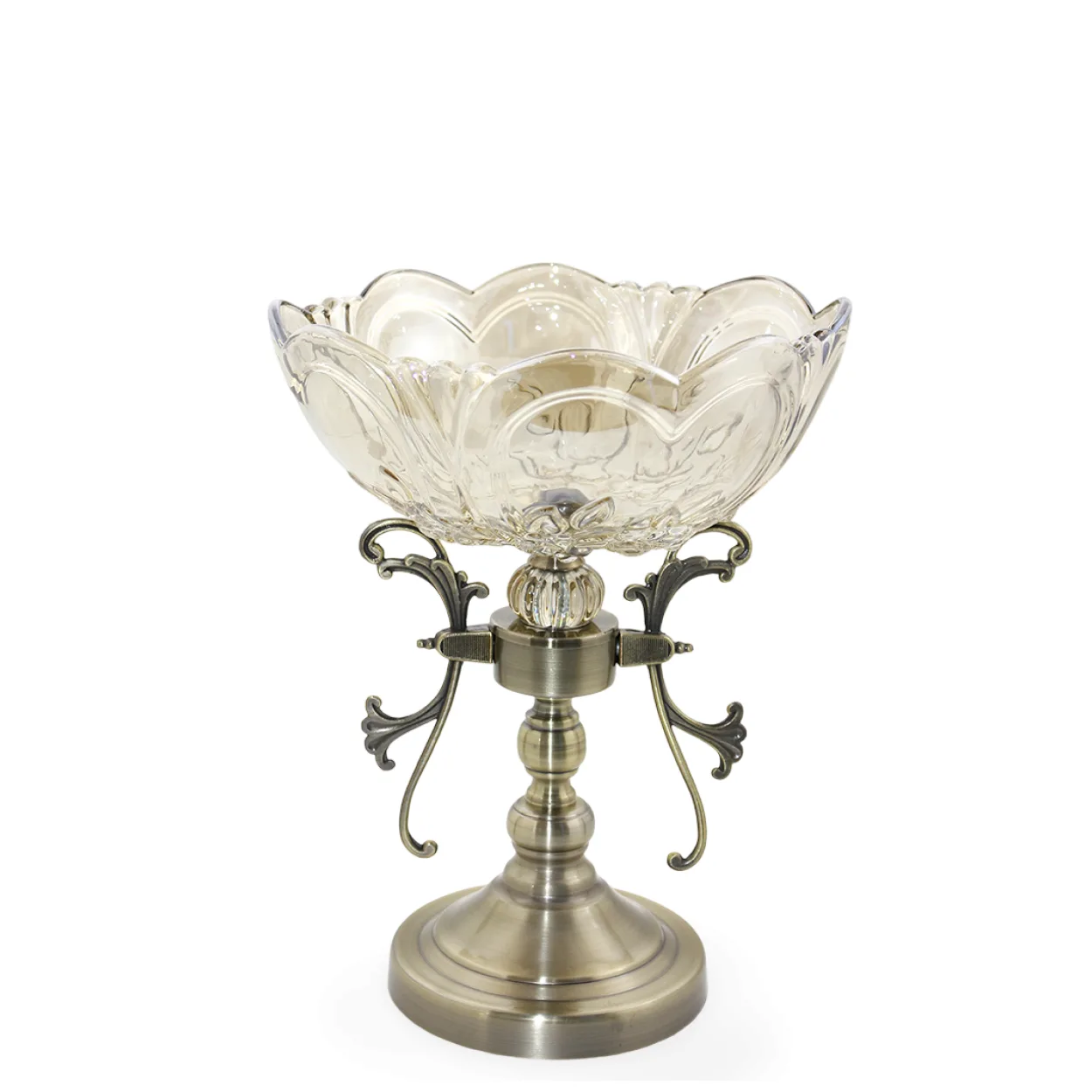 Ayaklı Eskitme Bronz Detaylı Dekoratif Cam Kase Şekerlik – Modern Sunum ve Servis Tabağı