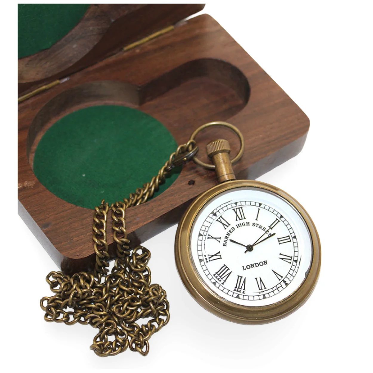 Nostaljik Barnes High Street London Tasarımlı Pirinç Köstekli Cep Saati ve Özel Ahşap Kutusu