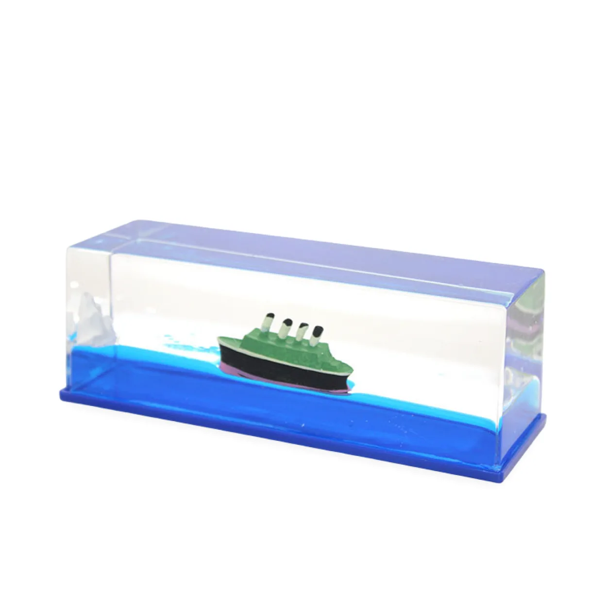 Bu büyüleyici Batmayan Gemi Sıvı Hareket Oyuncağı ile çalışma masanıza veya yaşam alanınıza huzur ve benzersiz bir atmosfer katın. Şık akrilik bloğun içinde yavaşça hareket eden gemi ve buzdağı figürleri, sakinleştirici bir görsel deneyim sunar. Gemi suyun üzerinde süzülürken buzdağına çarpmaz, böylece adının hakkını verir!