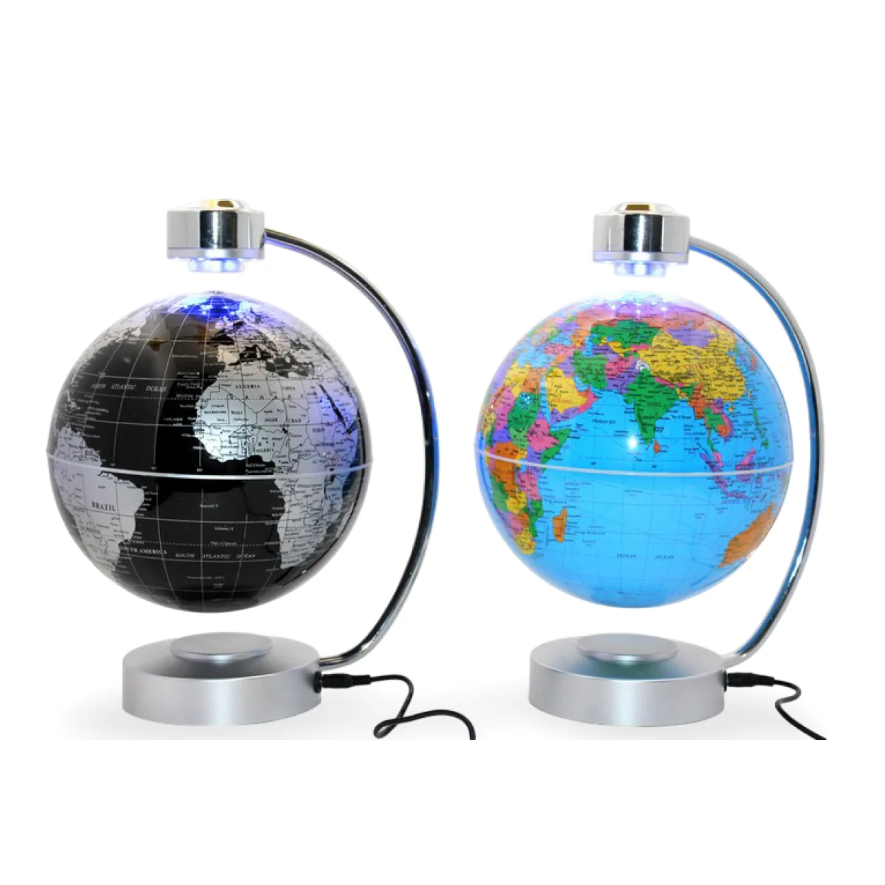 - Detaylı Dünya Haritası: İster siyahi-gümüş rengindeki zarif tasarımı, ister renkli ve detaylı siyasi harita görünümü olsun, her iki küre de dünya ülkelerini ve coğrafyalarını net bir şekilde gösterir. Bu sayede hem dekoratif bir obje hem de eğitici bir araç olarak kullanılabilir.