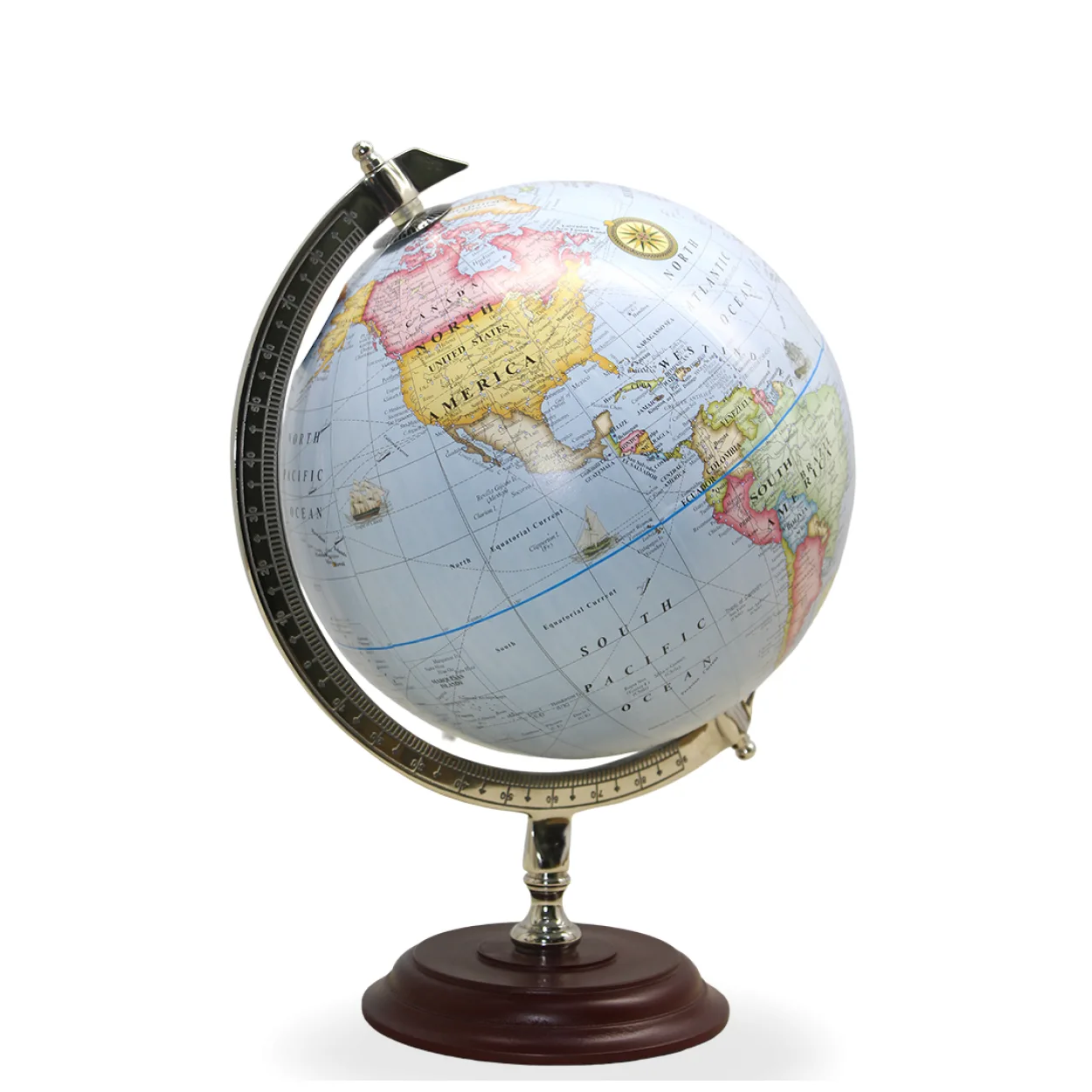 Özellik: Yüksek kaliteli malzemeden üretilen bu dünya küresi, parlak metalik bir meridyen ve sağlam, estetik bir ahşap tabana sahiptir. Harita üzerindeki canlı renkler, ülkeleri, kıtaları ve okyanusları net bir şekilde gösterirken, eski gemi çizimleri ve pusula gülü gibi detaylar ürüne otantik bir hava katmaktadır. Dünyayı 360 derece döndürme imkanı ile coğrafi keşiflerin tadını çıkarabilirsiniz.