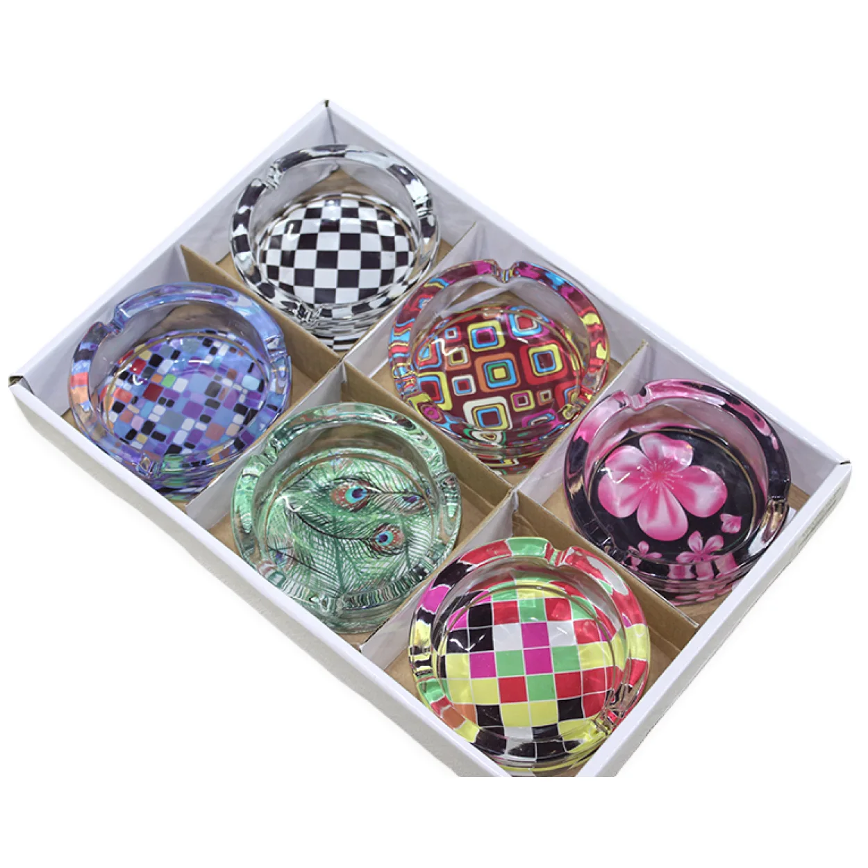 Dayanıklı cam malzemeden üretilen bu küllükler, uzun ömürlü kullanım sunarken kolay temizlenebilir yapısıyla da pratiklik sağlar. Kareli geometrik desenlerden, zarif tavus kuşu tüyü motiflerine, canlı çiçek figürlerinden modern soyut desenlere kadar geniş bir yelpazede sunulan tasarım seçenekleri sayesinde, tarzınıza en uygun olanı bulmanız çok kolay.