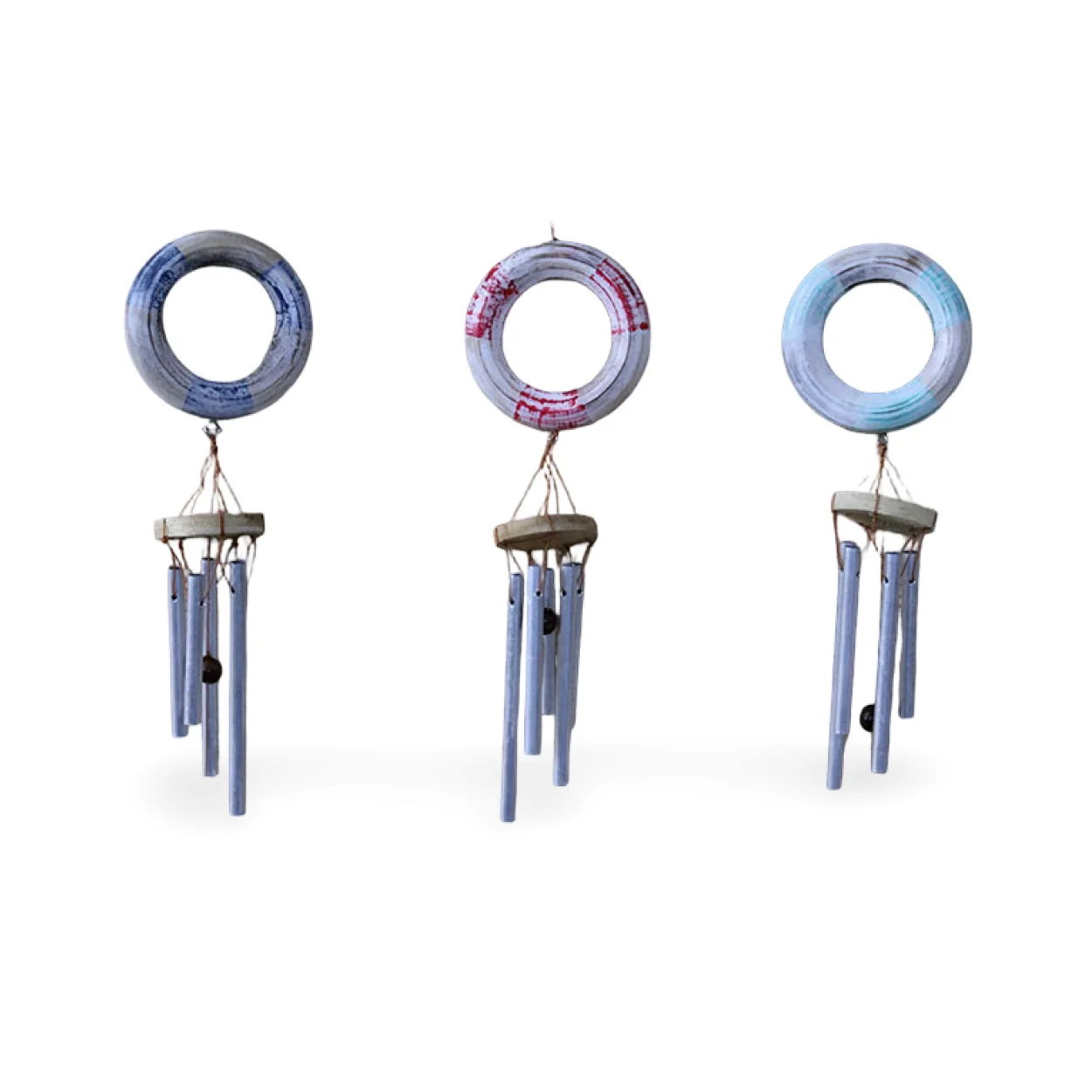 - El Yapımı Estetik: Ürünün üst kısmında yer alan dekoratif halka, özenle sarılmış ve farklı renk seçenekleriyle (mavi-beyaz, kırmızı-beyaz, açık mavi-beyaz) boyanarak göz alıcı bir dokunuş sunar. Bu eşsiz desenler, her bir rüzgar çanına kişisel bir karakter kazandırır.