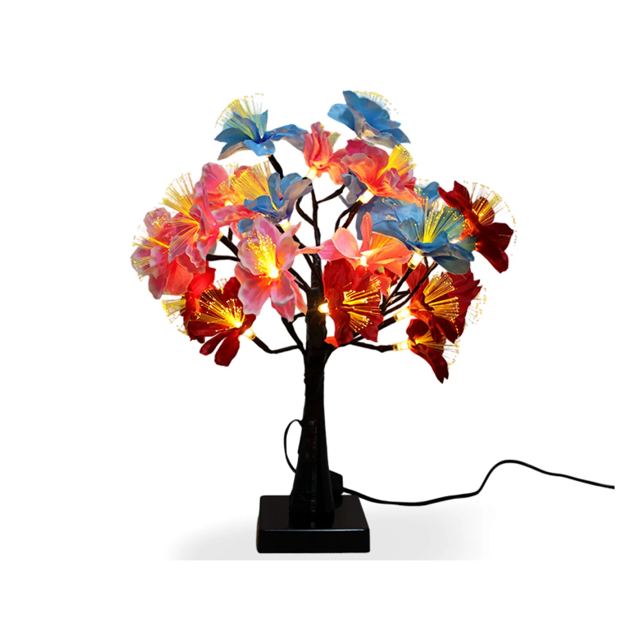 - Canlı Renkler ve Fiber Optik Işıklar: Kırmızı, pembe ve mavi tonlardaki yapay çiçekler, her birinin merkezinden yayılan sarımsı fiber optik ışıklarla birleşerek dinamik ve çok renkli bir görünüm oluşturur. Bu özel ışıklandırma, her çiçeği ayrı ayrı vurgular ve etrafına hoş bir parıltı yayar.