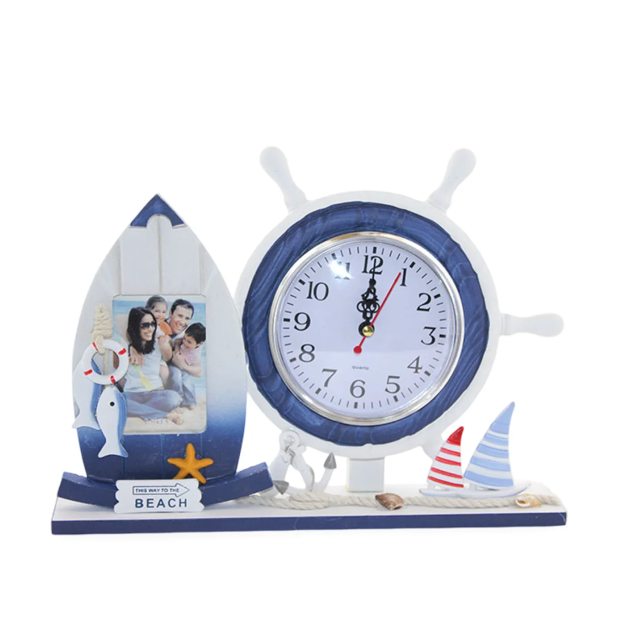 - Çift Fonksiyonlu Tasarım: Şık bir gemi dümeni şeklinde tasarlanmış analog saat ve tekne formunda kişisel fotoğraf çerçevesini bir arada sunar.