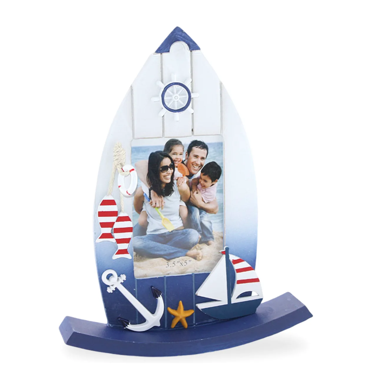 Çerçevenin üst kısmında şık bir dümen figürü, sol tarafında ipli detaylarla süslenmiş can simidi ve sevimli balıklar yer almaktadır. Alt kısımda ise denizci ruhunu tamamlayan detaylı bir çapa, canlı bir deniz yıldızı ve minyatür bir yelkenli gemi ile zenginleştirilmiştir. Bu detaylar, ürüne derinlik ve karakter katmaktadır. Dayanaklı ahşap malzemeden üretilen bu çerçeve, uzun ömürlü kullanım vaat eder.