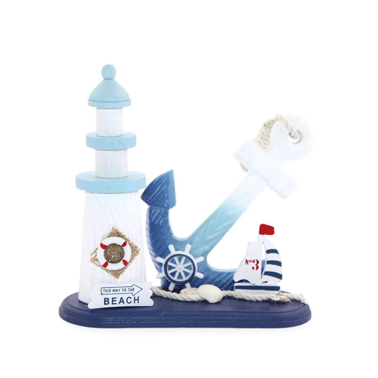 Detaylı El Sanatları: Deniz fenerinin üzerinde gerçekçi bir can simidi ve "THIS WAY TO THE BEACH" yön tabelası bulunurken, çapanın yanında zarif bir dümen figürü, minik bir yelkenli (N°3 bayraklı), kum ve deniz kabukları gibi detaylar mevcuttur.
