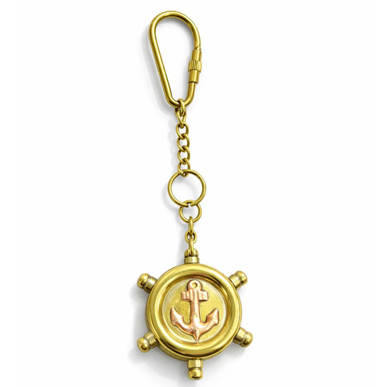 Deniz tutkunlarının ve şıklığına önem verenlerin vazgeçilmezi olacak bu özel pirinç anahtarlık, göz alıcı tasarımıyla dikkat çekiyor. Yüksek kaliteli pirinç malzemeden üretilmiş olan bu anahtarlık, marin temalı dümen formu ve ortasındaki zarif bakır çapa figürü ile öne çıkıyor. Klasik ve otantik görünümü, anahtarlarınıza veya çantanıza benzersiz bir hava katacak.