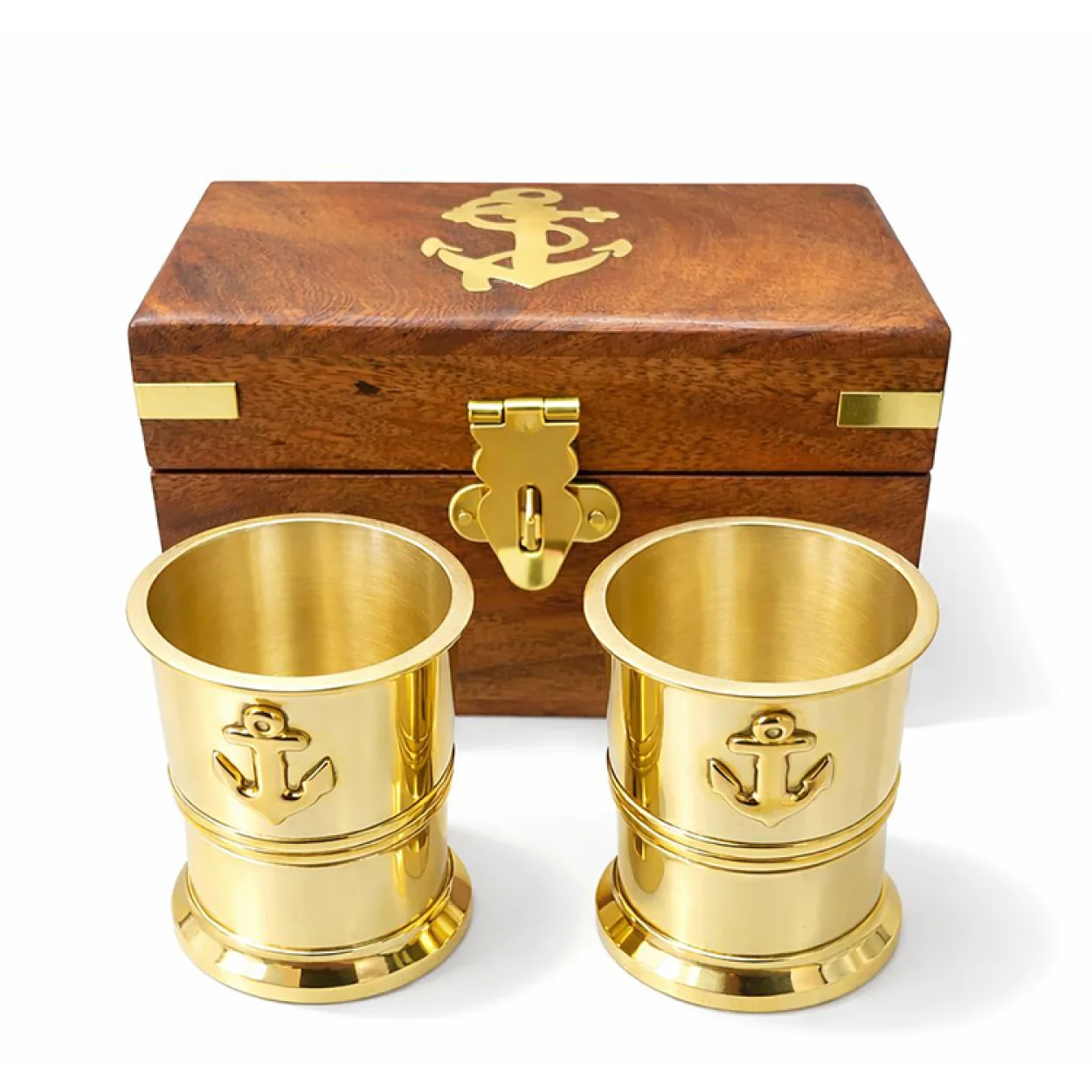 Denizci Temalı Ahşap Kutulu Çapa Motifli Pirinç Shot Bardak Seti | Lüks Hediye