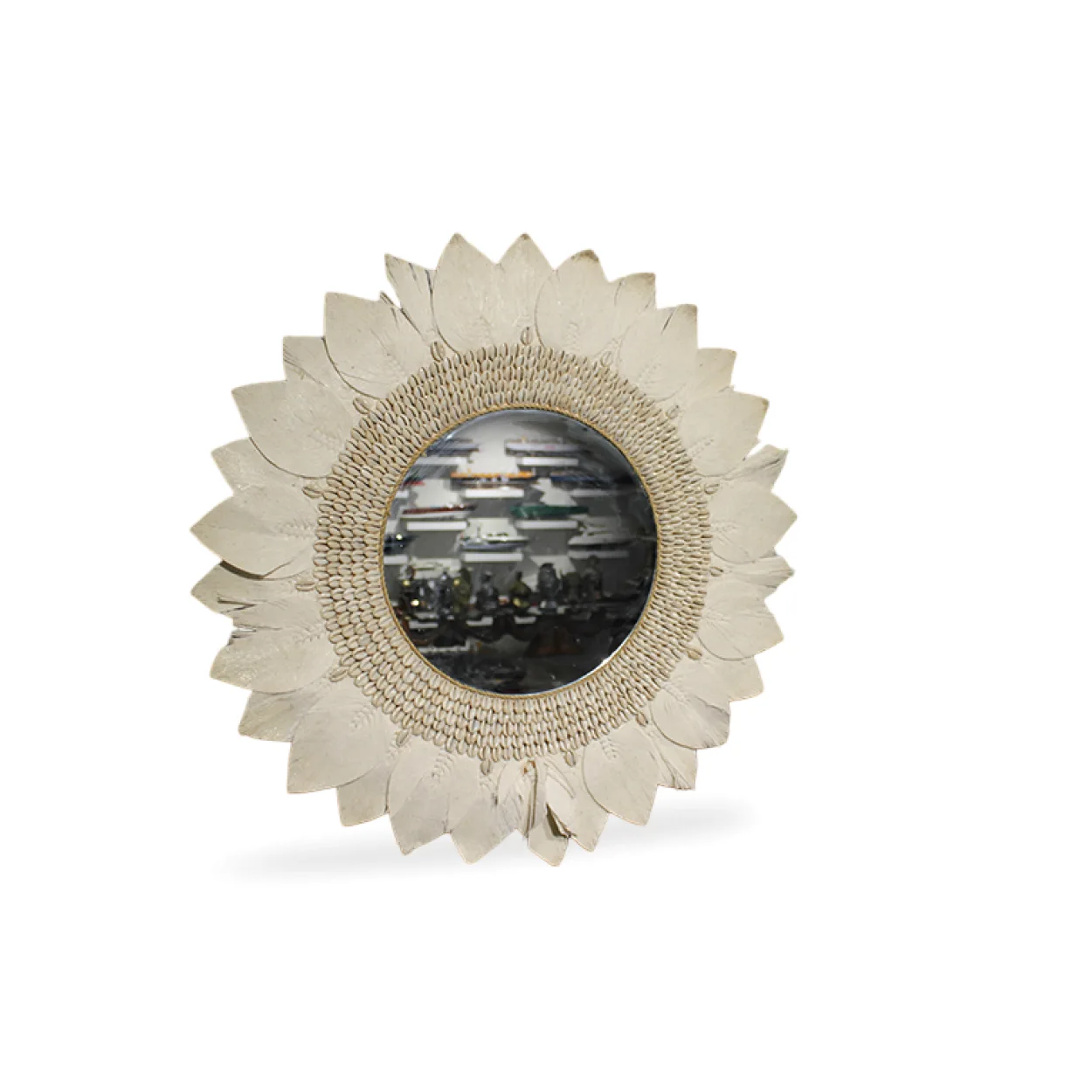 Benzersiz Tasarım: Güneşi andıran formu ve çevresini saran doğal yaprak/tüy görünümlü detaylar ile dikkat çeker. Aynanın iç çerçevesi ise özenle yerleştirilmiş minik deniz kabukları veya boncuklarla süslenmiştir, bu da ürüne eşsiz bir doku ve derinlik katar.