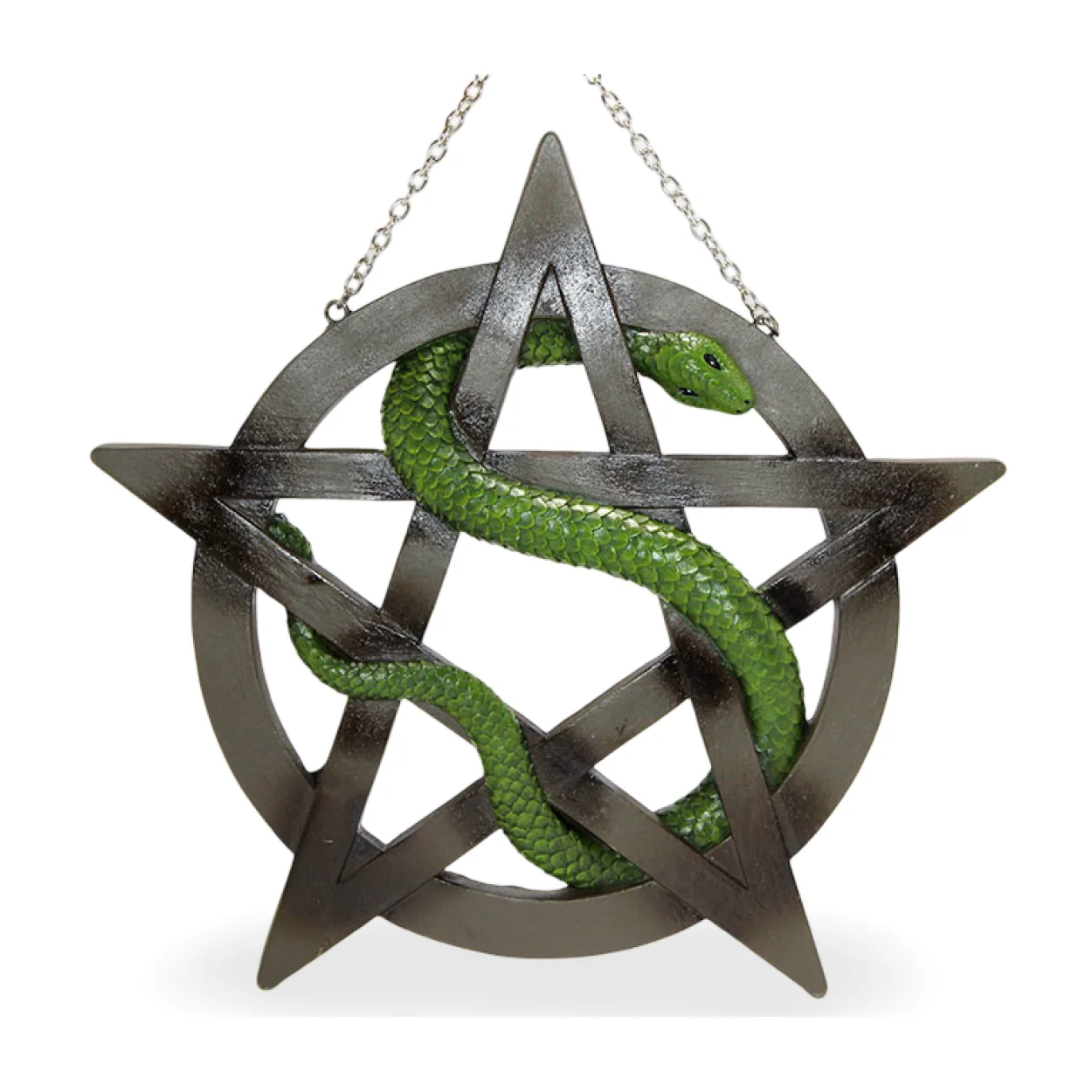 Çarpıcı Tasarım: Canlı yeşil renkli, pulları detaylı işlenmiş yılan figürü, siyah/antrasit tonlarındaki pentagram çerçevesiyle harika bir kontrast oluşturur.