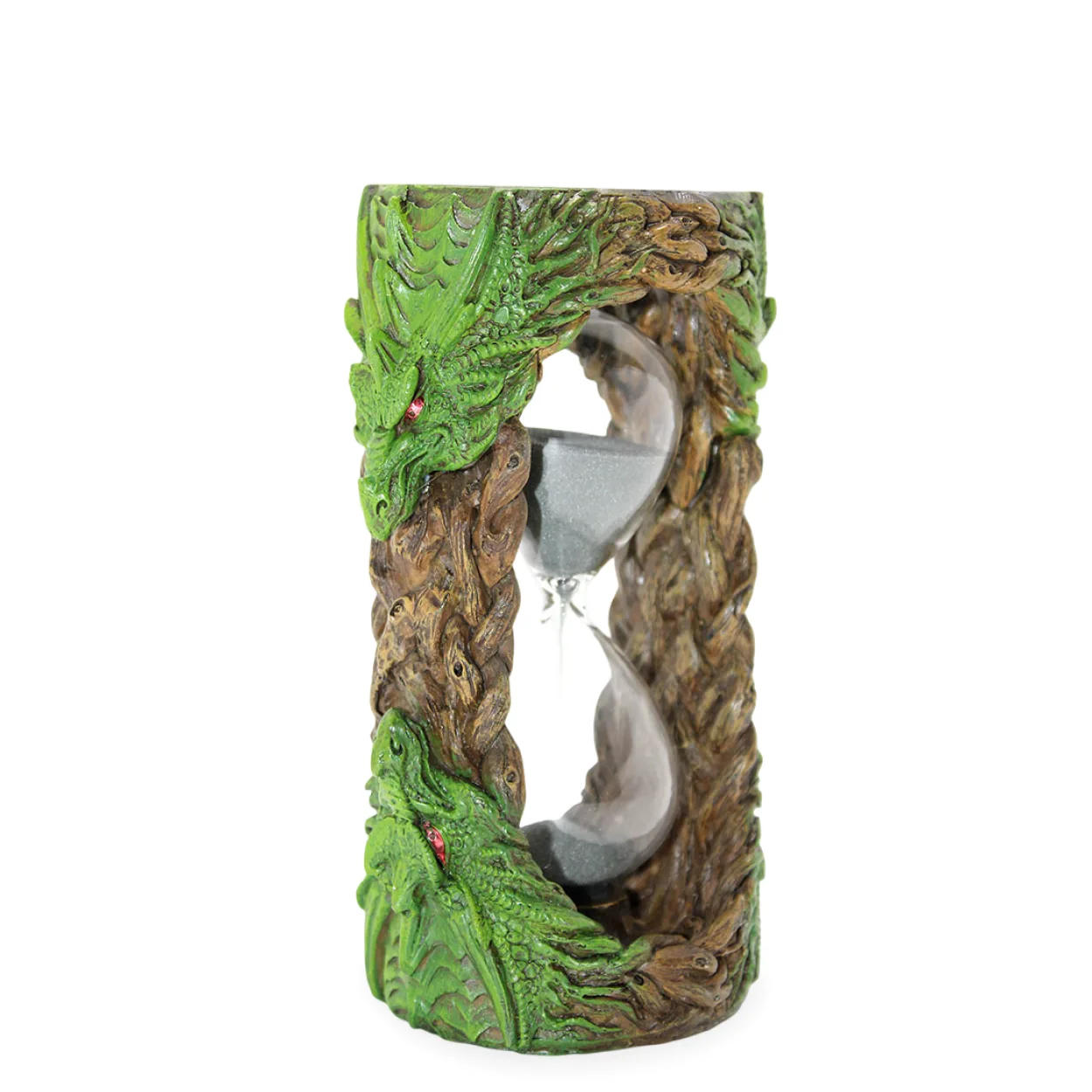 Bu özel kum saati, iki tarafta da yükselen ve iç içe geçmiş yemyeşil ejderha figürleriyle süslenmiştir. Ejderhaların keskin hatları ve kırmızı parlayan gözleri, ürüne dinamik ve güçlü bir karakter kazandırır.