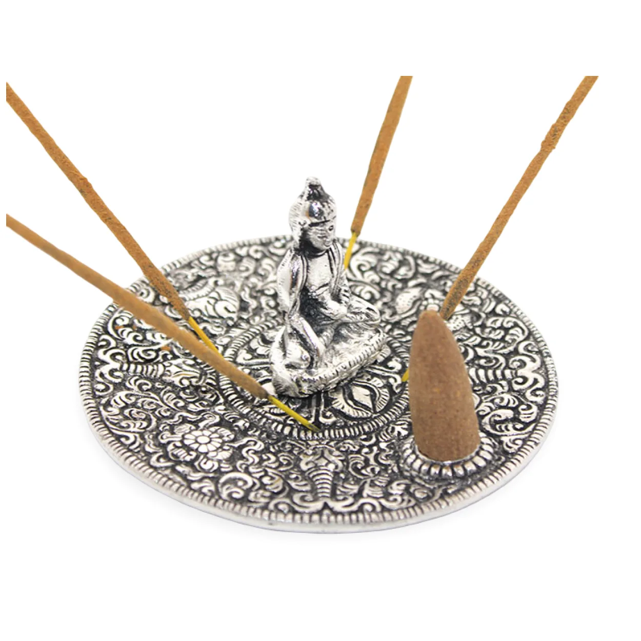 Malzeme ve Tasarım: Yüksek kaliteli metalden üretilmiş olan bu tütsülük, antik gümüş görünümlü detaylı el işçiliği ile dikkat çeker. Merkezinde yer alan zarif Buda figürü, dinginlik ve maneviyat sembolüdür. Yuvarlak tabanındaki girift desenler, ürüne otantik ve sofistike bir hava katar.