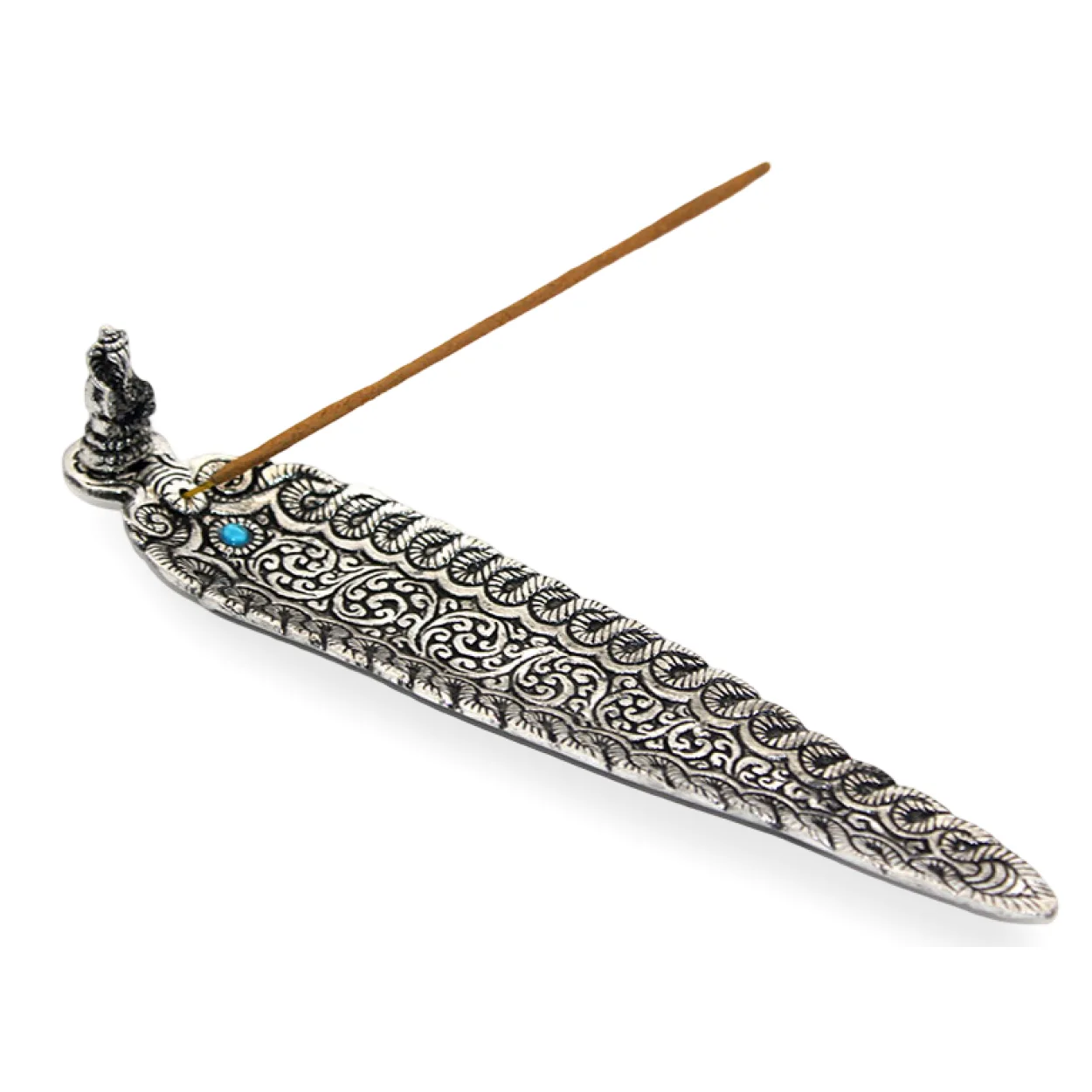 Bu tütsülük, detaylı el işçiliği ile şekillendirilmiş metalden üretilmiştir. Kayık formundaki zarif gövdesi, antik desenlerle bezenmiş olup, her bir kıvrımında ince bir sanat anlayışı yansıtır. Tütsülüğün ön kısmında yer alan Ganeşa biblosu, bilgelik ve yeni başlangıçların sembolü olarak tasarıma derinlik katmaktadır. Ortasındaki turkuaz benzeri taş detayı ise ürüne sofistike bir parlaklık kazandırır. Tütsülüğünüz sadece tütsülerinizi yakmakla kalmaz, aynı zamanda külleri güvenle toplar, böylece temiz ve düzenli bir kullanım sağlar.