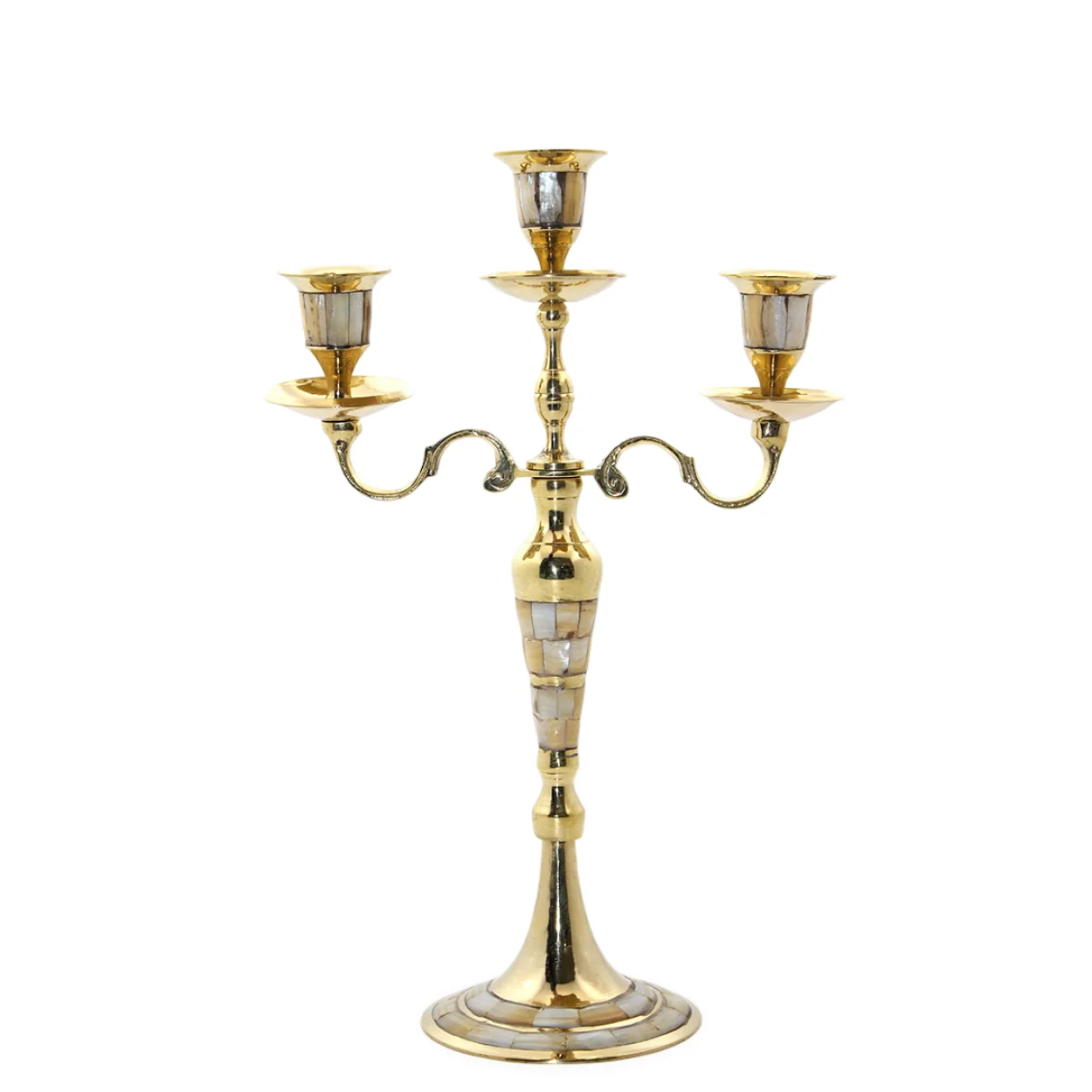 El İşçiliği Pirinç ve Sedef Kakmalı Üç Kollu Şamdan | Salon ve Masa Dekoru İçin Eşsiz Sanat Eseri