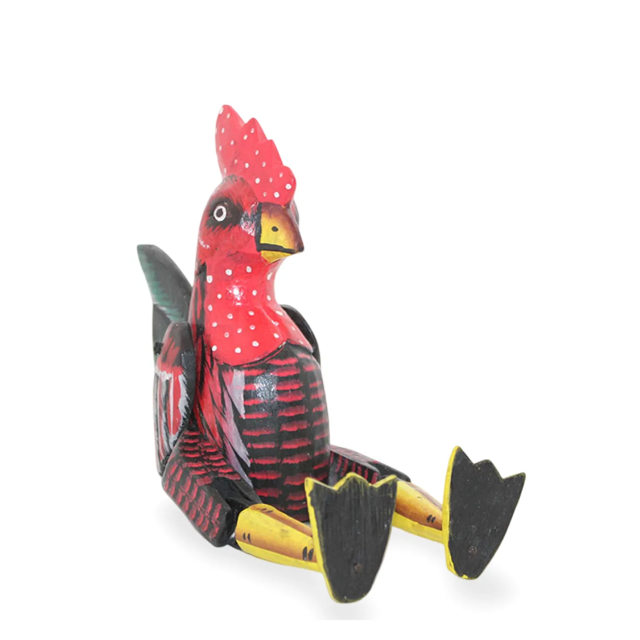 Eşsiz Tasarım: Kırmızı, siyah ve sarı renklerin harmanlandığı, beyaz puantiyelerle süslenmiş sevimli bir horoz figürü.