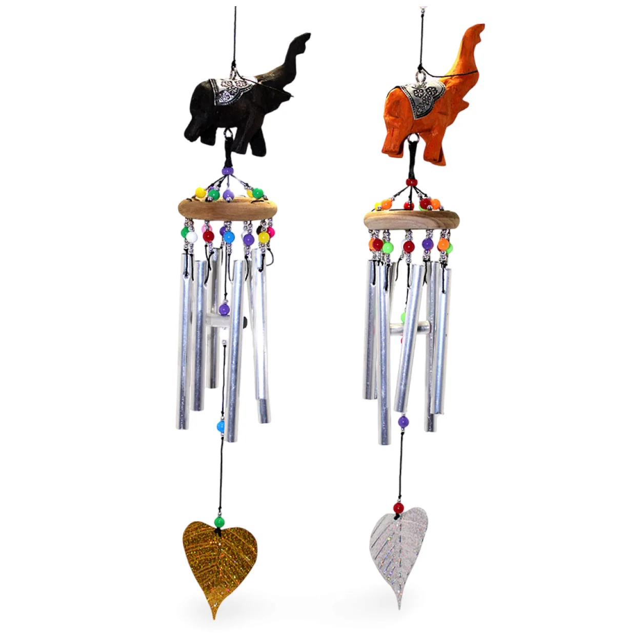 El Yapımı Ahşap Fil Biblolu, Renkli Boncuklu Metal Borulu Dekoratif Rüzgar Çanı