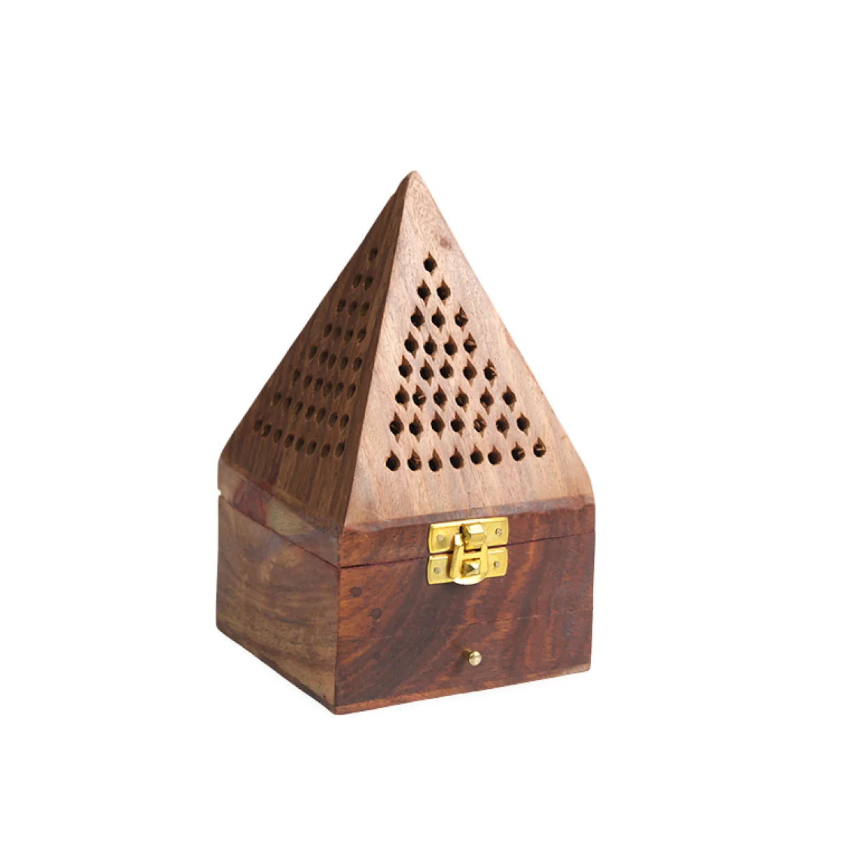 Ürünün dikkat çekici piramit formu, estetik bir görünüm sunarken, dört bir yanındaki özenle delinmiş havalandırma delikleri sayesinde tütsünüzün dumanını zarifçe yayarak hoş kokuların ortamda eşit şekilde dağılmasını sağlar. Ön yüzünde bulunan pirinç kilit mekanizması ve zarif küçük topuz detayı, tütsülüğe otantik bir hava katarken, kullanım kolaylığı da sunar. İç kısmına konik, çubuk veya reçine tütsülerinizi rahatlıkla yerleştirebilirsiniz.