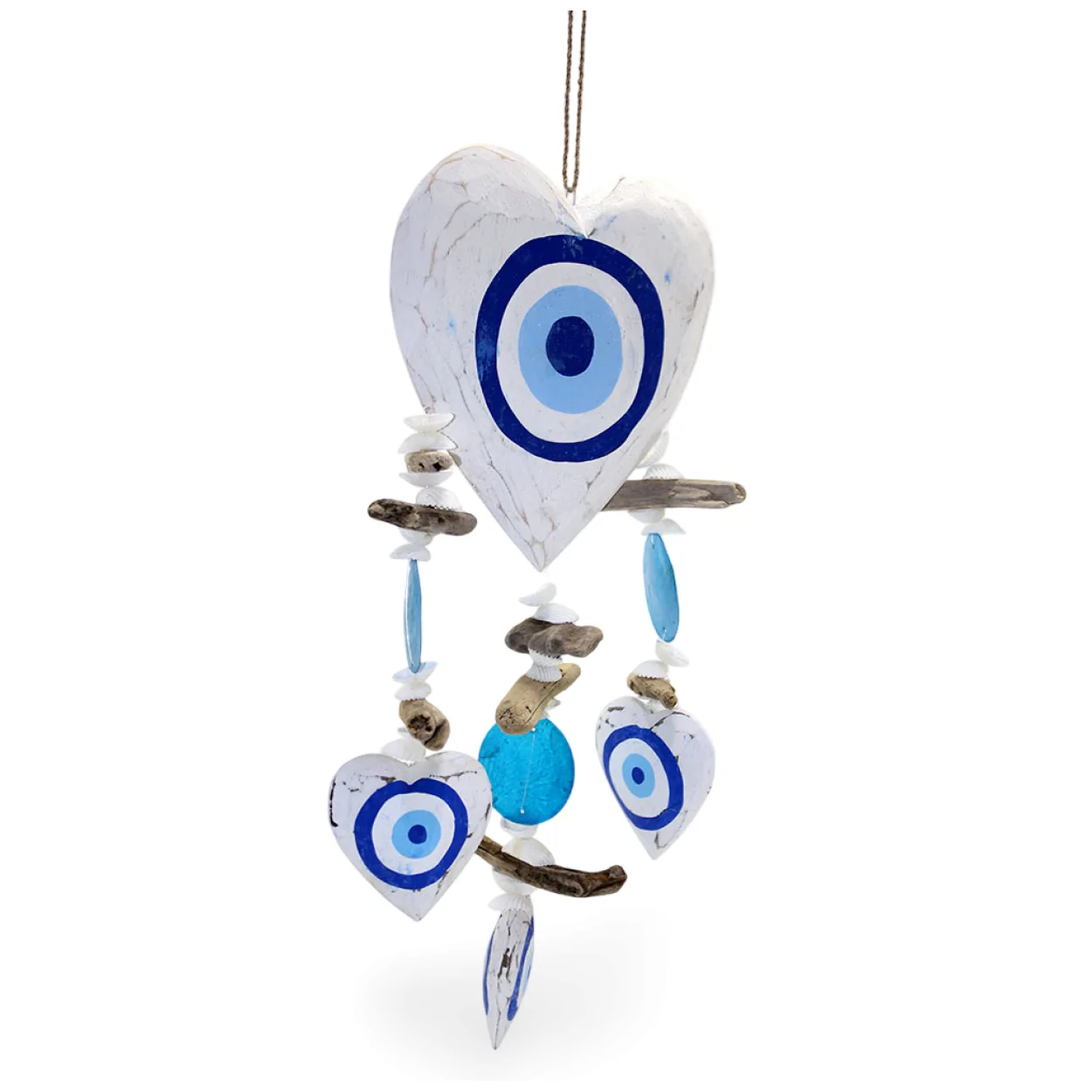 El Yapımı Beyaz Eskitme Ahşap Kalp ve Nazar Boncuğu Temalı Rüzgar Çanı Dekoratif Obje