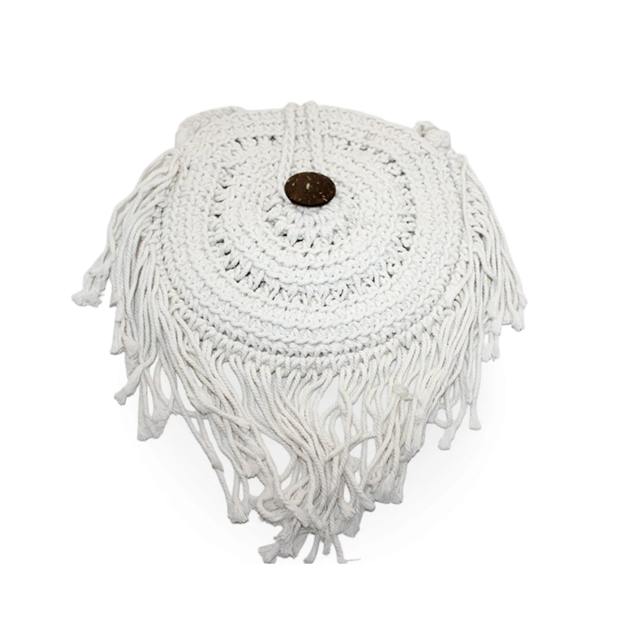 El Yapımı Bohem Beyaz Yuvarlak Makrome Çanta | Fringe Detaylı Plaj ve Yaz Stili