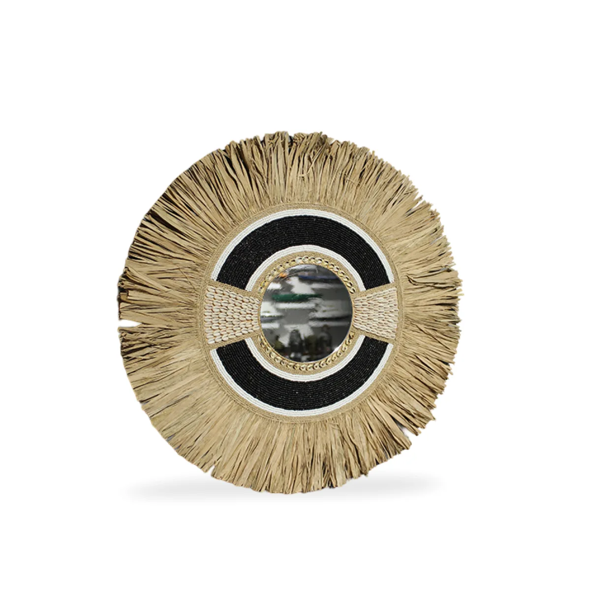 - Detaylı İşçilik: Aynanın iç çerçevesi, el yapımı siyah ve beyaz boncuk dizileriyle süslenmiştir. Bu boncuklar, modern bir çizgi sunarken, aralara serpiştirilmiş doğal deniz kabukları ve örgülü ip detayları, ürüne otantik ve etnik bir hava katmaktadır.