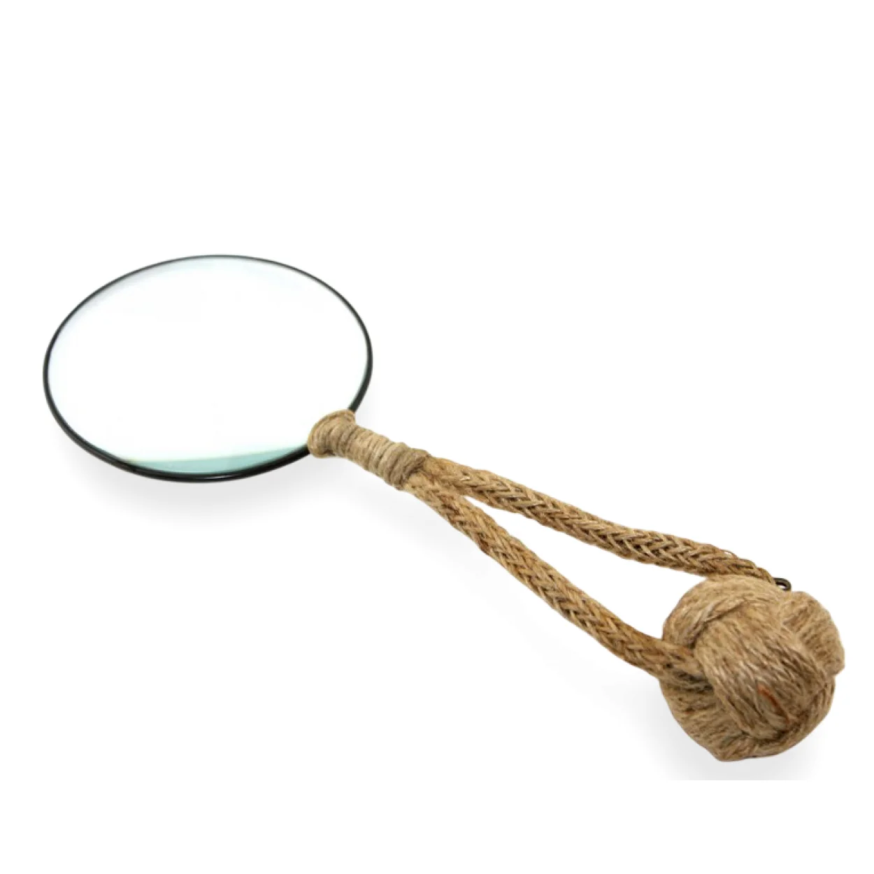 Bu büyütecin en dikkat çekici özelliği, hiç şüphesiz özenle örülmüş hasır ipinden oluşan ergonomik tutacağıdır. Geleneksel denizci düğümü olan "maymun yumruğu" formunda son bulan bu hasır sap, ürüne otantik bir karakter kazandırmaktadır. Her bir ilmeği el emeğiyle işlenmiş olan bu tutacak, sadece görsel bir şölen sunmakla kalmaz, aynı zamanda rahat bir kavrayış sağlar. Doğal jüt ipinin rustik dokusu, modern yaşam alanlarına sıcaklık ve doğallık getirirken, aynı zamanda eski dünya cazibesini de beraberinde taşır. Bu detay, büyüteci sıradan bir objeden çıkarıp, hikayesi olan özel bir parçaya dönüştürür. Özellikle denizcilik temalı dekorasyonları sevenler için vazgeçilmez bir tamamlayıcıdır.