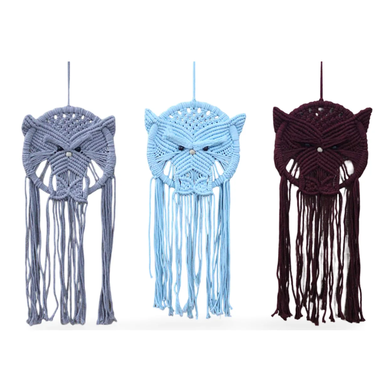 Ürünlerimiz, tamamen el yapımı olup, bu sayede her bir biblo figürü kendine özgü bir karaktere sahiptir. Gri, açık mavi ve bordo olmak üzere üç farklı renk seçeneğiyle sunulan bu düş kapanları, yaşam alanlarınıza huzurlu ve estetik bir hava katar. Baykuşun bilge ve koruyucu ruhunu yansıtan detaylar, makrome sanatının inceliğiyle birleşerek duvarlarınızda sanatsal bir biblo etkisi yaratır. Rüyalarınıza eşlik ederken, evinize pozitif enerji yayar.