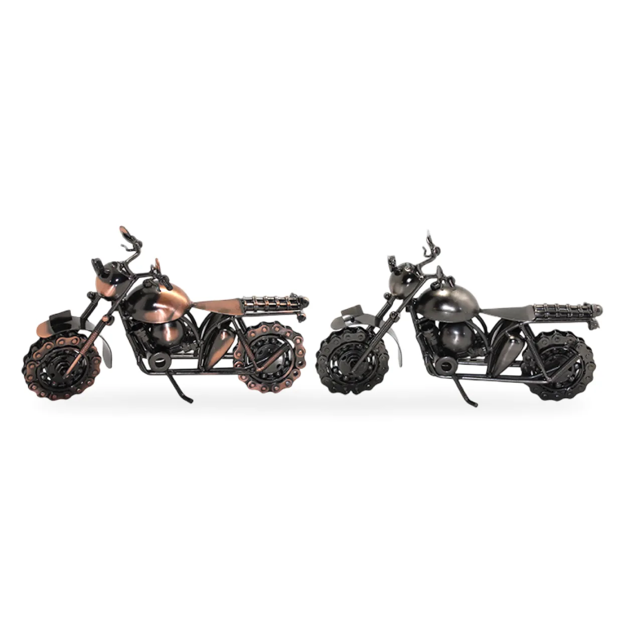 Ev veya ofis dekorasyonunuza endüstriyel şıklık katacak bu özel tasarım metal motor biblolarıyla tanışın. Her biri detaylı el işçiliğiyle üretilmiş bu figürler, motosiklet tutkunları ve özgün dekorasyon objeleri arayanlar için mükemmel bir seçimdir. İki farklı renk tonuyla sunulan bu set, mekanlarınıza rustik ve modern bir hava katarken, aynı zamanda göz alıcı bir odak noktası oluşturur. Zincir ve bilye detaylarıyla zenginleştirilmiş bu motor bibloları, yaşam alanlarınıza karakter katmak için idealdir.