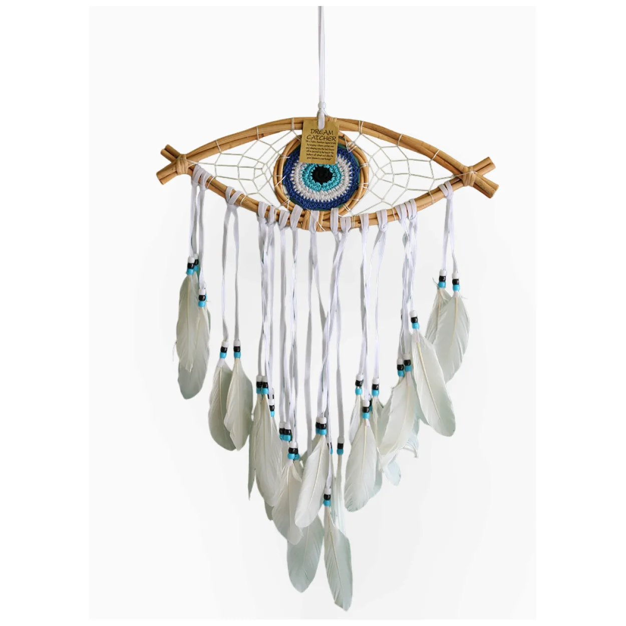 Bu özel rüya kapanı, ortasındaki otantik nazar boncuğu deseniyle dikkat çeken el örgüsü detayı ve göz şeklindeki bambu çerçevesiyle modern ve geleneksel unsurları harmanlıyor. Zarif beyaz tüy detayları ve boncuk işlemeleri, ürüne hafiflik ve hareket katıyor. Her bir tüy, özenle seçilmiş ve işlenmiştir, evinizde huzurlu bir atmosfer yaratır.