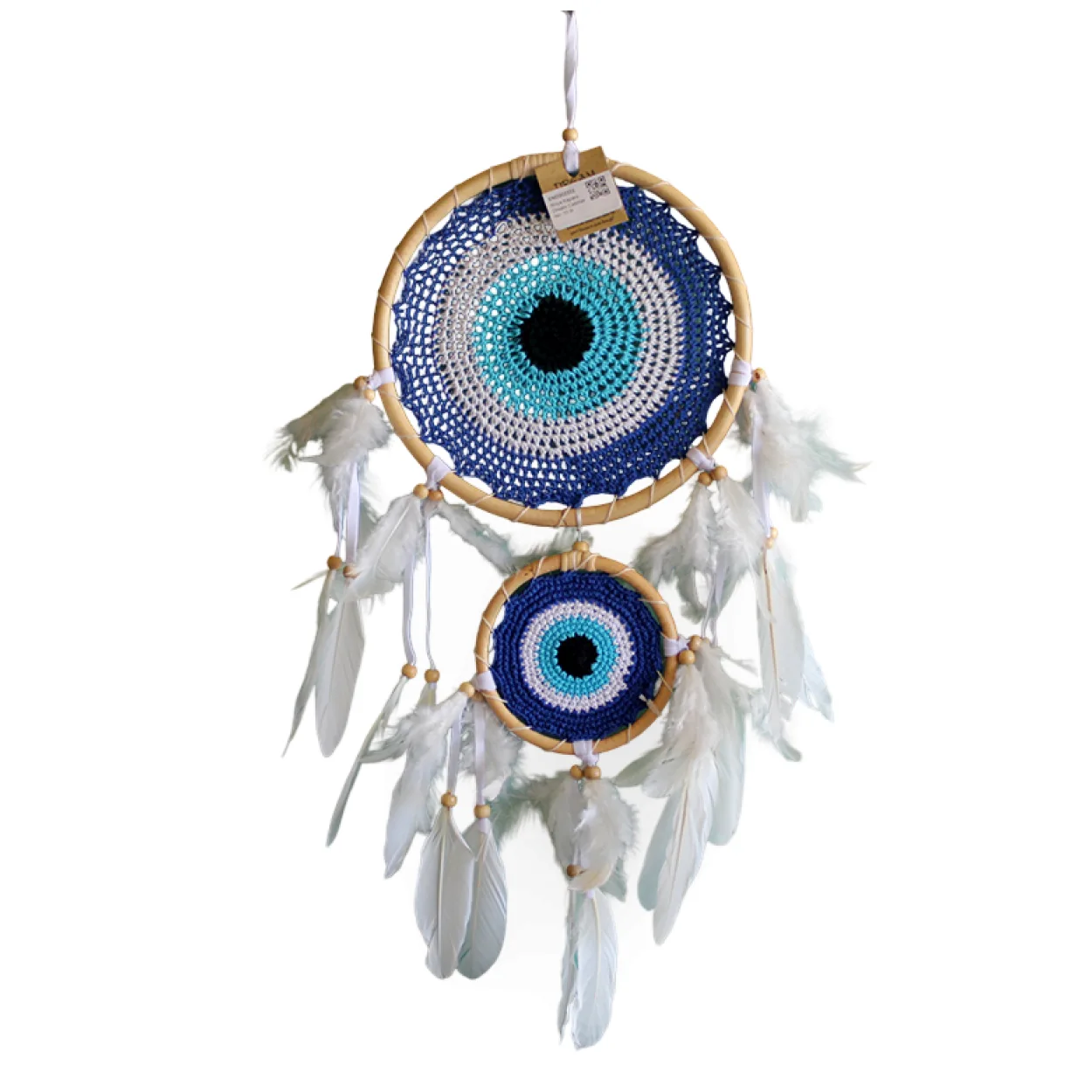 Bu eşsiz el yapımı düş kapanı, otantik nazar boncuğu deseniyle ev veya ofis dekorasyonunuza mistik bir dokunuş katıyor. Rüyaları yakalama ve kötü enerjileri uzaklaştırma inancıyla tasarlanan bu özel parça, sadece estetik bir aksesuar değil, aynı zamanda anlamlı bir biblodur. Canlı mavi, beyaz ve turkuaz tonlarındaki örgü detayı, ortasındaki çarpıcı siyah noktayla bütünleşerek geleneksel nazar boncuğu figürünü mükemmel bir şekilde yansıtıyor. Her bir tüy detayı özenle seçilmiş olup, rüzgarda nazikçe salınarak huzurlu bir atmosfer yaratır. Evinize pozitif enerji getirecek bu dekoratif ürün, misafirlerinizin de dikkatini çekecek benzersiz bir görünüme sahiptir. Asıldığı her yerde dikkat çekici bir odak noktası oluşturur. Sevdikleriniz için anlamlı ve özel bir hediye alternatifi olarak da düşünülebilir.