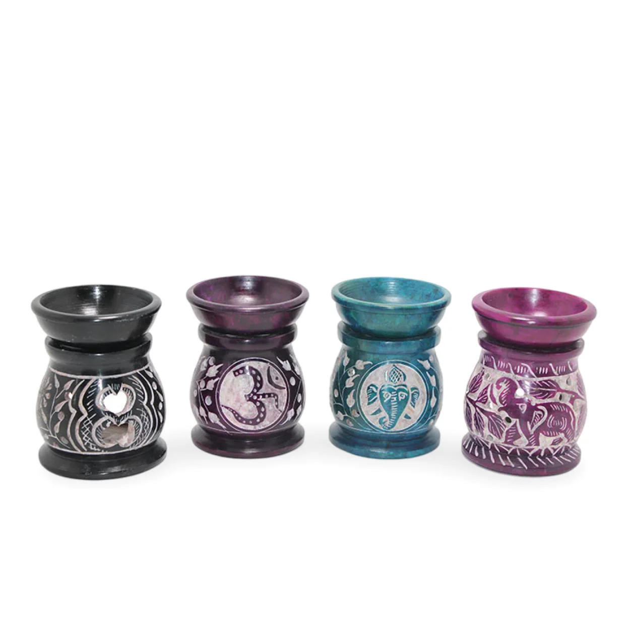 Buhurdanlıklarımız, görselde sunulan zengin renk (siyah, mor, turkuaz, fuşya) ve oyma desen seçenekleriyle dikkat çekmektedir. Her bir renk tonu, obsidyenin doğal güzelliğini ortaya çıkarırken, üzerindeki ince el işçiliği oymalar (Om sembolü, Ganesha figürü, fil motifleri, kalp ve çiçek desenleri gibi) ürüne otantik bir karakter kazandırır. Bu detaylı oymalar, ışıkla etkileşime girerek büyüleyici gölgeler yaratır ve her bakışta farklı bir hikaye anlatır.