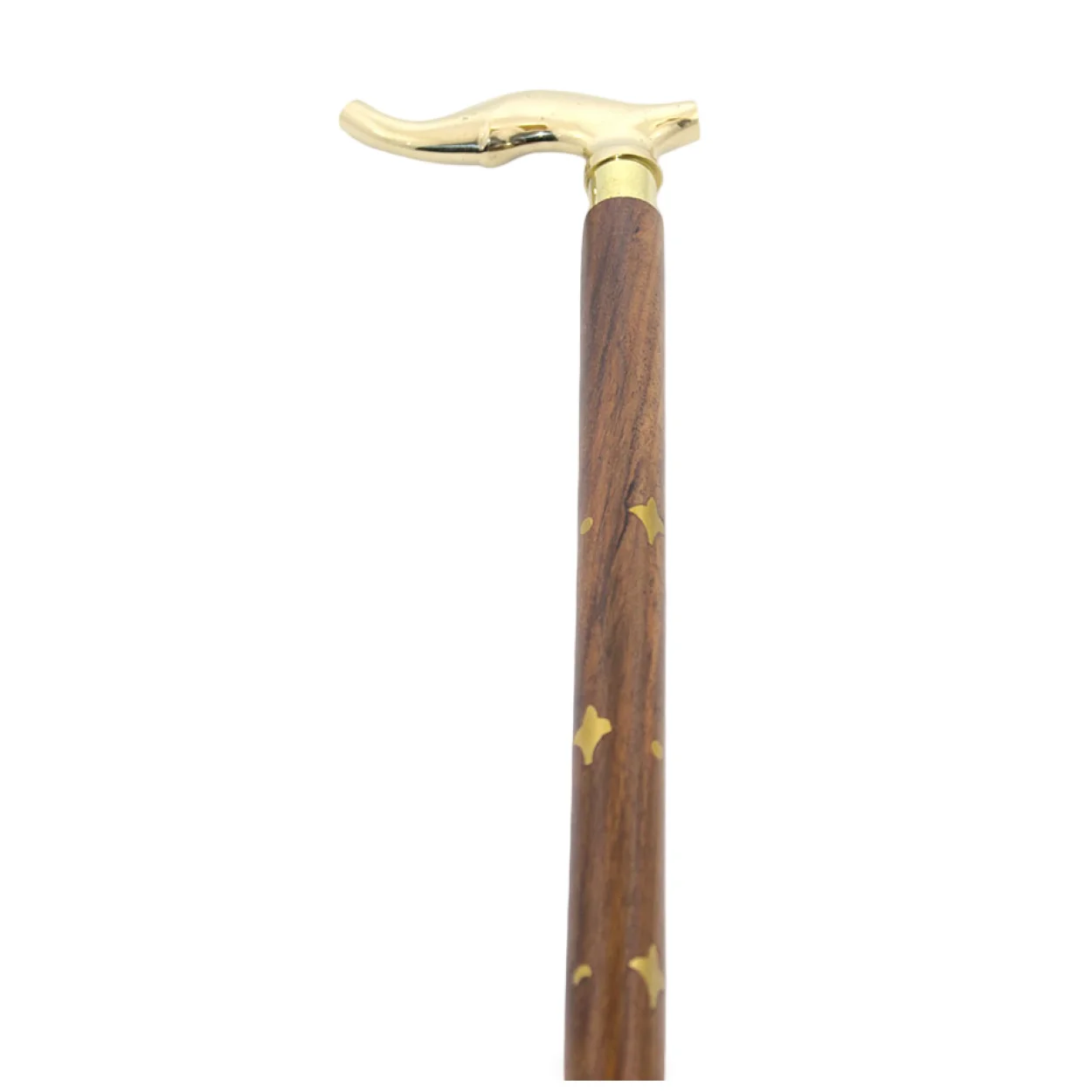 El Yapımı Pirinç Saplı Ahşap Yıldız İşlemeli Şık Baston - 93 cm Klasik Yürüyüş Destek Çubuğu