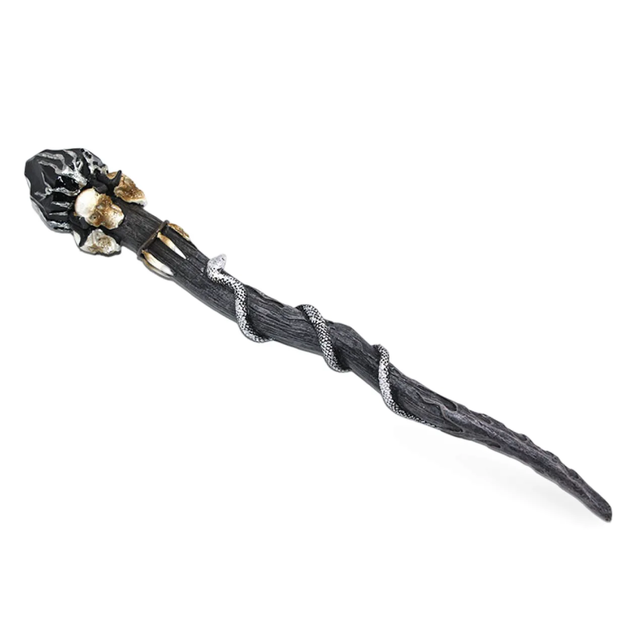 Bu fantastik asa, koyu renkli, yıpranmış görünümlü ahşap dokusuyla eski ve güçlü bir yadigar izlenimi bırakır. Asanın tepesi, ürkütücü ve bir o kadar da etkileyici kurukafa ve kemik detaylarıyla süslenmiştir, bu da ona derin bir gotik karakter kazandırır. Gövdesini saran kıvrımlı gümüş renkli yılan figürü ise asanın büyülü enerjisini ve gizemini pekiştirir. Göz alıcı detayları ve sağlam polyester malzemesi sayesinde uzun yıllar boyunca koleksiyonunuzun veya dekorasyonunuzun en değerli parçalarından biri olmaya adaydır.