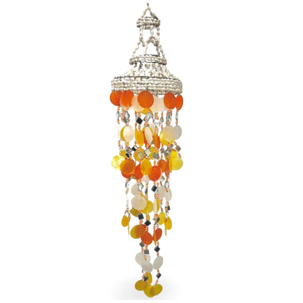 Portakal, limon sarısı ve krem tonlarındaki diskler, rüzgarın nazik esintileriyle dans ederek hem görsel bir şölen sunar hem de hafif, rahatlatıcı sesler çıkarır. Aralardaki parlak ayna detaylı boncuklar ve minik turuncu taneler, ürüne modern bir ışıltı katarken, el işçiliğinin inceliğini gözler önüne serer.