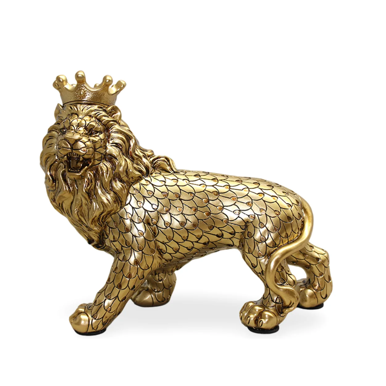 Estetik Tasarım: Altın rengi parlaklığı ve üzerinde taşıdığı kraliyet tacı ile aslanın gücünü ve soyluluğunu yansıtan benzersiz bir görsel şölen sunar. Gövdesindeki pul desenleri ve parıldayan taş detayları, figüre modern bir dokunuş katar.