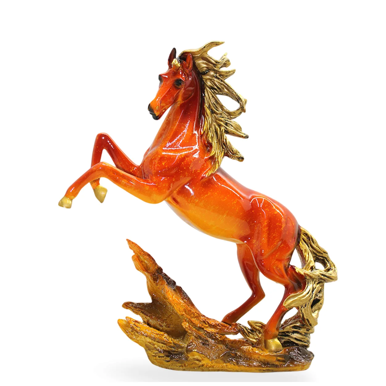 Bu özel üretim figür, yüksek kaliteli polyester malzemeden özenle üretilmiştir. Şahlanmış pozisyonu, atın dinamik ruhunu ve zarafetini mükemmel bir şekilde yansıtır. Canlı turuncu-kırmızı tonlarındaki gövdesi ve altın rengi parlak yelesi ile kuyruğu, figüre çarpıcı bir görünüm kazandırır. Her bir detayı ustaca işlenmiş olup, bibloya gerçekçi ve sanatsal bir hava verir.