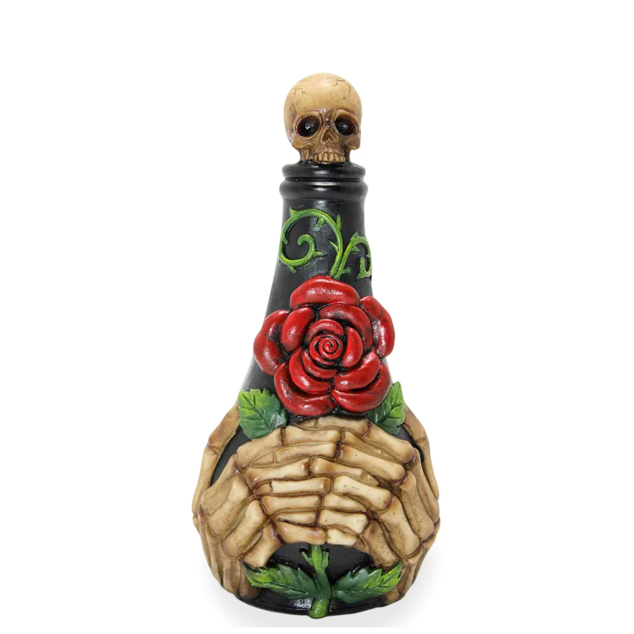 Ev dekorasyonunuza gizemli ve romantik bir dokunuş katmak isteyenler için özel olarak tasarlanmış bu polyester figür, gotik estetiği ve hassas işçiliği bir araya getiriyor. Siyah bir şişe formundaki gövdesi, canlı yeşil sarmaşıklarla süslenmiş olup, merkezinde tutku dolu kızıl bir gül motifini barındırır. Bu etkileyici gülün hemen altında, ürüne dramatik bir hava katan kemik eller yer almaktadır. Ürünün tepesinde ise dikkat çekici bir kuru kafa biblosu bulunmaktadır, bu da tasarıma derinlik ve karakteristik bir özellik katmaktadır.