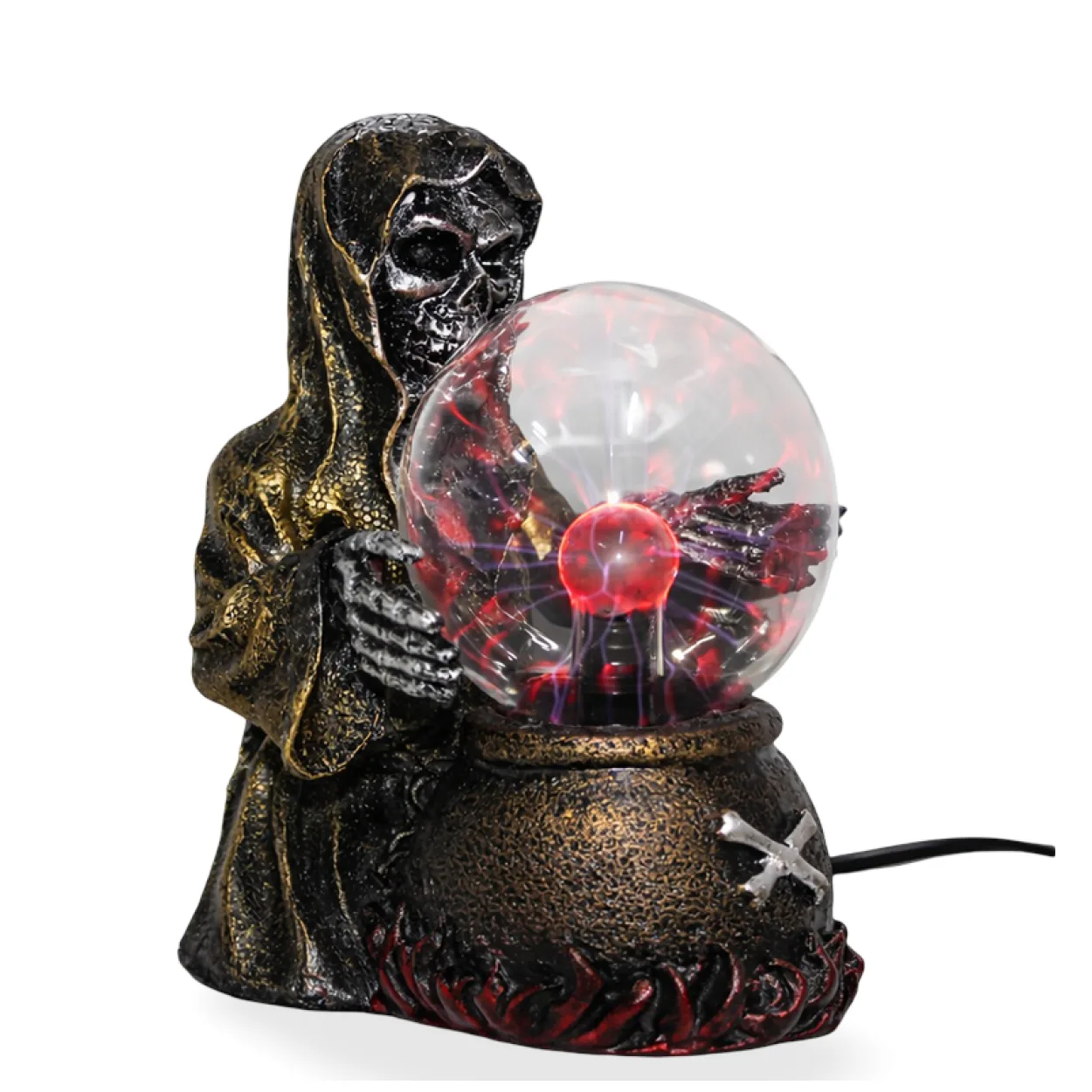 Korkutucu ve büyüleyici bir atmosfer yaratın! Gotik Azrail temalı bu plazma lamba ile Cadılar Bayramı ruhunu evinize taşıyın. Detaylı işçilikle polyesterden üretilen bu dekoratif figür, ürkütücü bir Azrail'in mistik bir küreyi tuttuğu anı yakalar. Kürenin içindeki elektrik deşarjları, göz alıcı kırmızı ve mor ışık hüzmeleriyle gerçeküstü bir şimşek etkisi yaratır. Dokunduğunuzda ışıkların parmaklarınıza doğru akmasıyla etkileşimli bir deneyim sunan bu lamba, her ortama gizemli bir hava katacak. Oturma odası, çalışma masası veya özel koleksiyonlarınız için mükemmel bir biblo ve ışık kaynağıdır. Özellikle Cadılar Bayramı partilerinde veya korku temalı dekorasyonlarda başrol oynayacak. Dayanıklı polyester malzemesi sayesinde uzun yıllar boyunca ilk günkü estetiğini korur.