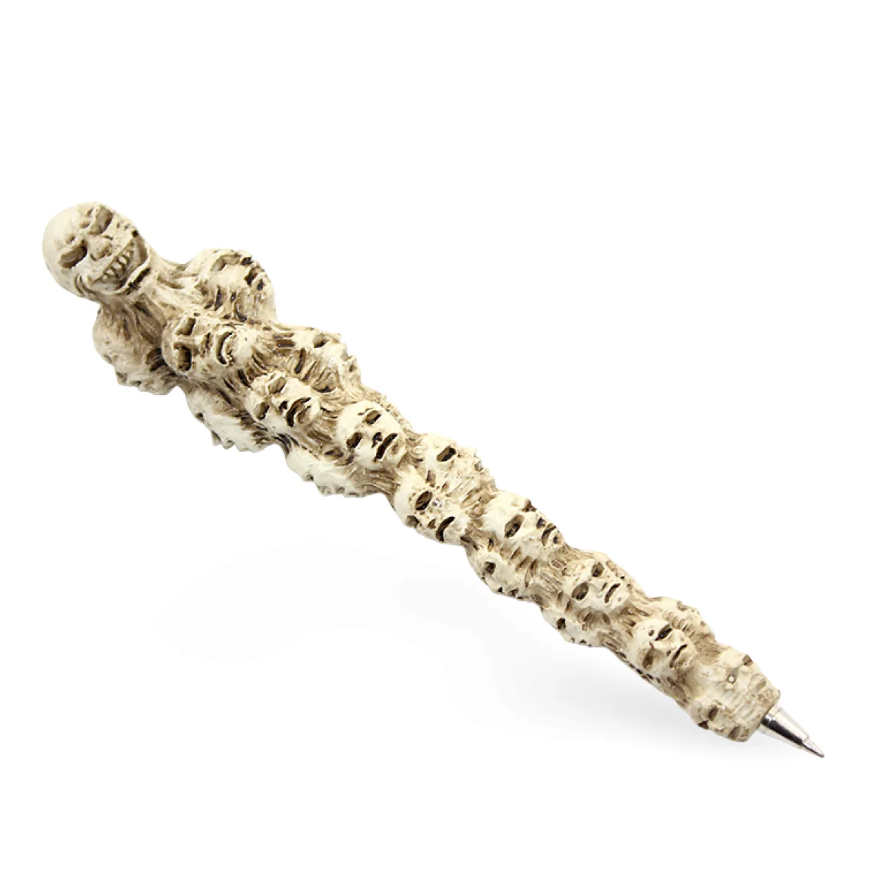 Her bir detayı özenle işlenmiş bu tükenmez kalem, tepesindeki büyük kurukafa figüründen başlayarak gövdesi boyunca sıralanan irili ufaklı iskelet yüzleriyle adeta bir sanat eseridir. Gerçekçi ve ürkütücü detaylarıyla dikkat çeken bu tasarım, gotik temalı ürünleri sevenler, korku filmi hayranları veya sadece farklı ve çarpıcı objeler arayanlar için idealdir.