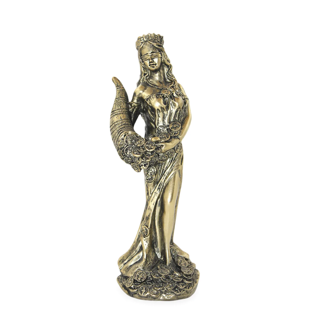 Bu özel figür, yüksek kaliteli polyester malzemeden özenle üretilmiştir. Altın rengi patinayla antik bir görünüm kazandırılmış detaylı işçiliği, her bir ayrıntısında estetik bir derinlik sunar. Fortuna'nın üzerindeki zengin giysiler, dökülen paralar ve tuttuğu bereket boynuzu, yaşam alanlarınıza zenginlik ve zarafet katar. Bu biblo, evinizin salonunda, çalışma masanızda, ofisinizde veya kütüphanenizde dikkat çekici bir odak noktası oluşturarak pozitif bir atmosfer yaratır.