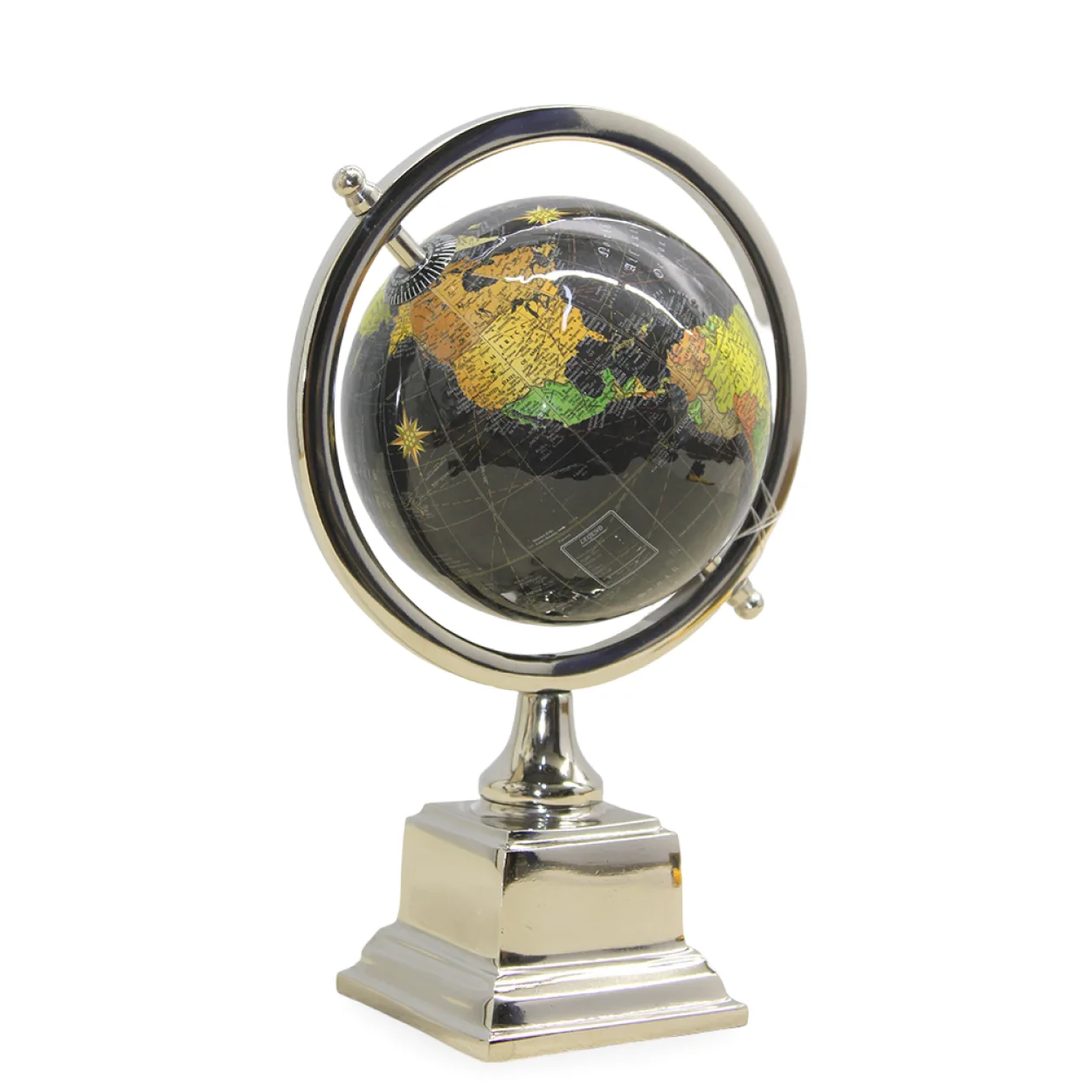 Her detayı özenle tasarlanmış bu modern dekoratif dünya küresi, yaşam veya çalışma alanlarınıza sofistike bir dokunuş katmak için idealdir. Siyah zemin üzerine işlenmiş canlı renklerdeki kıtalar ve parlak gümüş rengi metal standı ile dikkat çeken bu ürün, estetik ve işlevselliği bir araya getiriyor. Hem bilgilendirici hem de göz alıcı bir dekorasyon objesi arayanlar için mükemmel bir seçimdir.