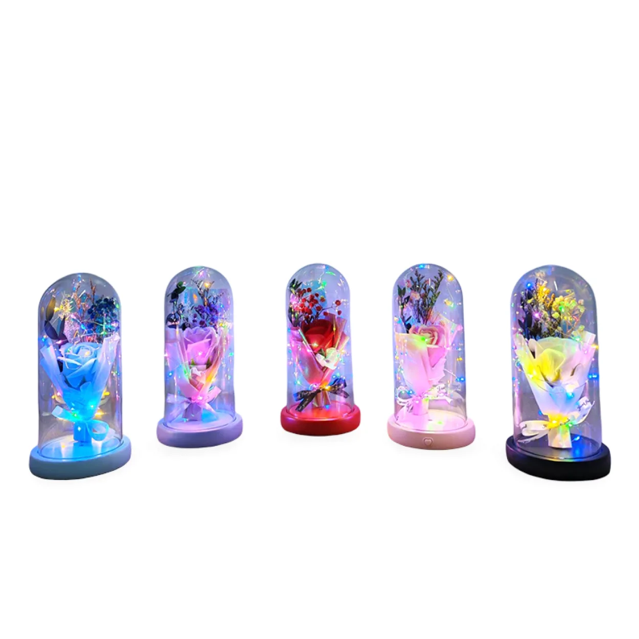 - Işıltılı LED Aydınlatma: Fanusun içindeki minik LED ışıklar, gül ve çevresini nazikçe aydınlatarak sıcak ve davetkar bir ambiyans yaratır. Geceleri veya loş ışıkta mekana büyülü bir dokunuş katar.